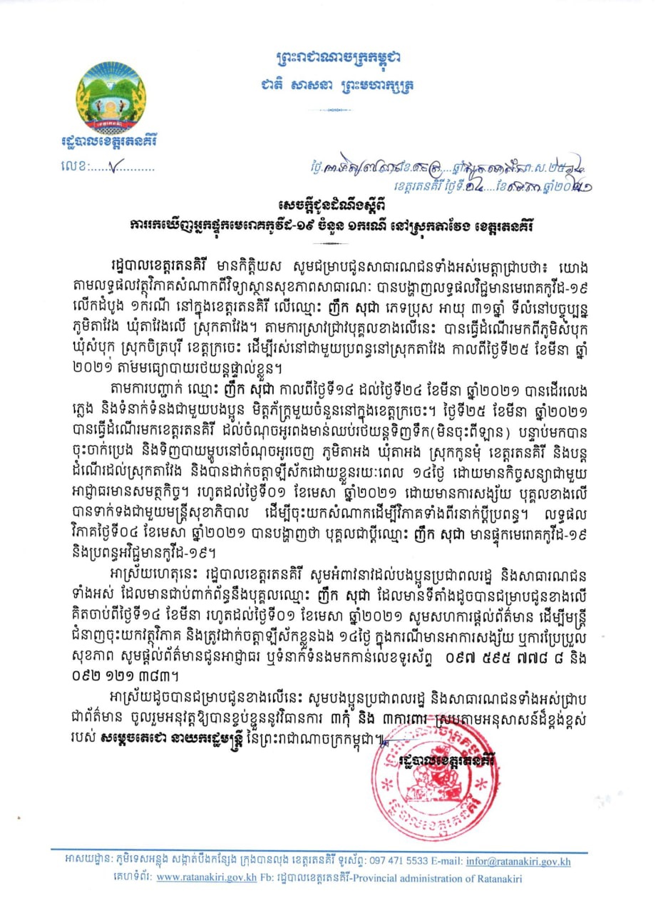 ខេត្តរតនគិរី រកឃើញអ្នកកើតកូវីដ១៩ ជាលើកដំបូង