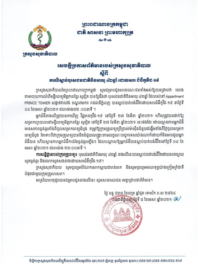 នាព្រឹកថ្ងៃទី០៥ ខែមេសា ឆ្នាំ២០២១ ក្រសួងសុខាភិបាលបានចេញសេចក្តីជូនព័ត៌មានមួយស្តីពីការស្លាប់អ្នកជំងឺម្នាក់ជាជនជាតិចិន អាយុ៤២ឆ្នាំ ដោយសារជំងឺកូវីដ-១៩ នៅមន្ទីរពេទ្យមិត្តភាពខ្មែរ-សូវៀត កាលពីថ្ងៃទី០៤ ខែមេសា ឆ្នាំ២០២១ នៅវេលាម៉ោង២២:០០នាទីយប់។