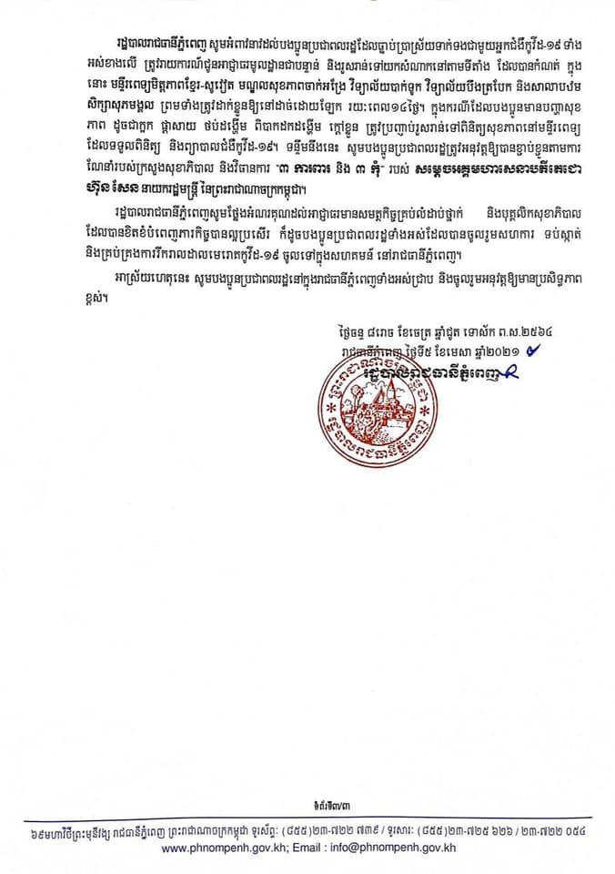 មុននេះ រដ្ឋបាលរាជធានីភ្នំពេញ បានបង្ហាញអត្តសញ្ញាណអ្នកជំងឺឆ្លងថ្មីទាំង ៣០នាក់ នៅរាជធានីភ្នំពេញ ហើយរដ្ឋបាលរាជធានីភ្នំពេញ ក៏បានអំពាវនាវដល់បងប្អូនប្រជាពលរដ្ឋដែលធ្លាប់ប្រាស្រ័យទាក់ទងជាមួយអ្នកជំងឺកូវីដ-១៩ ទាំងអស់ខាងក្រោម ត្រូវរាយការណ៍ជូនអាជ្ញាធរមូលដ្ឋានជាបន្ទាន់ និងរួសរាន់ទៅយកសំណាកនៅតាមទីតាំងដែលបានកំណត់៕