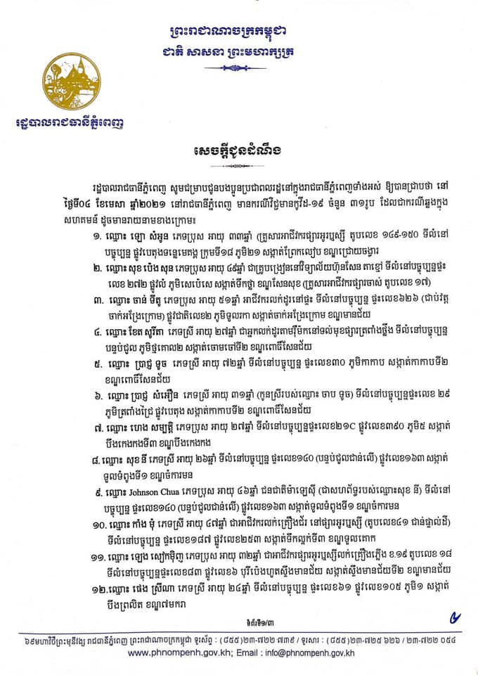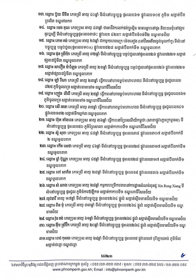 រដ្ឋបាលរាជធានីភ្នំពេញ បង្ហាញអត្តសញ្ញាណអ្នកឆ្លងកូវីដទាំង៣១នាក់នៅភ្នំពេញ