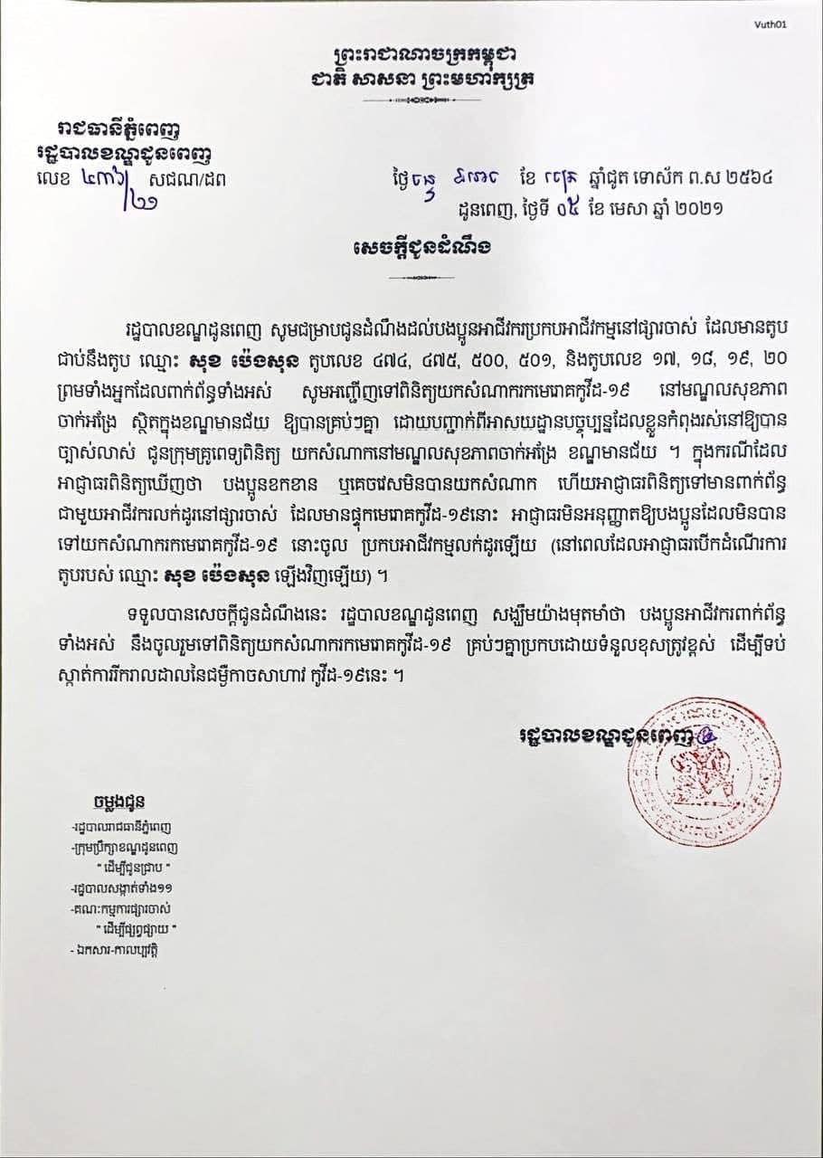 អាជ្ញាធរខណ្ឌដូនពេញ ប្រកាសអោយអាជីវករតូបផ្សារចាស់ ដែលនៅជាប់តូប ឈ្មោះ សុខ ប៉េងសុន និងអ្នកជាប់ពាក់ព័ន្ធប្រញាប់ទៅធ្វើតេស្តអោយបានលឿនបំផុត