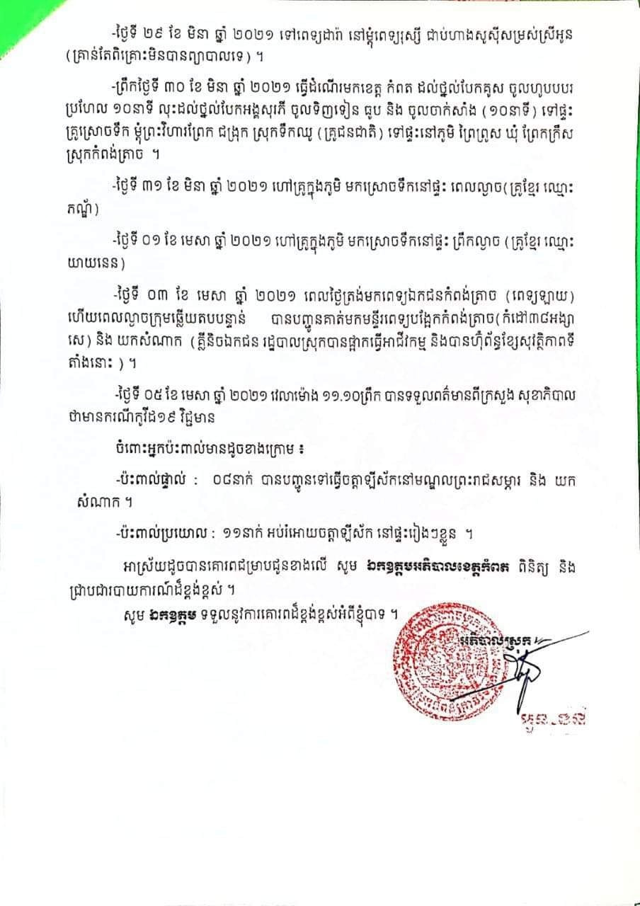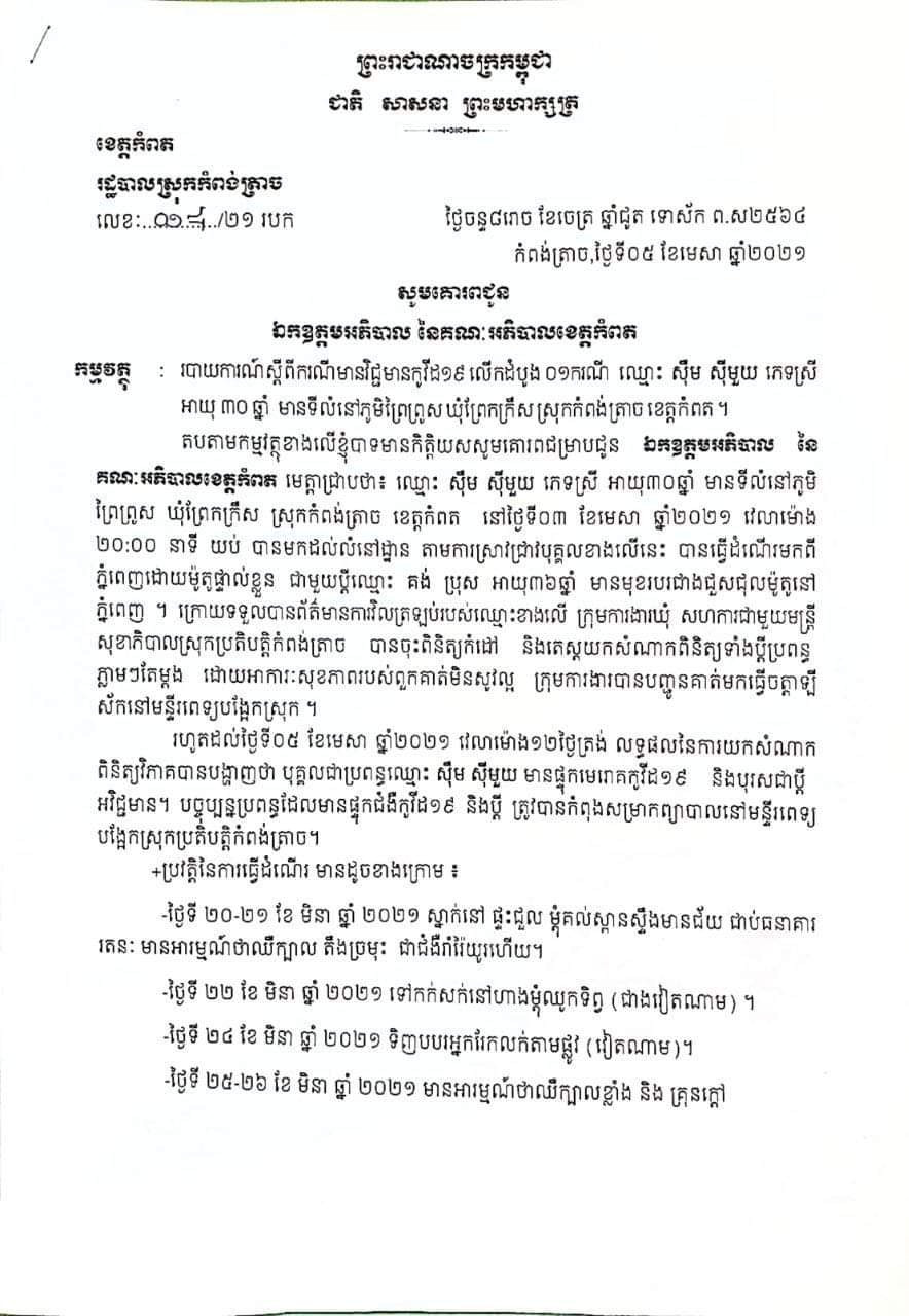 លិខិតរដ្ឋបាលស្រុកកំពង់ត្រាចមួយច្បាប់ ត្រូវបានរាយការណ៍ទៅកាន់លោកអភិបាលខេត្តកំពត ស្តីពីការរកឃើញវិជ្ជមានកូវីដ-១៩ លើស្ត្រីម្នាក់មានឈ្មោះ ស៊ឹម ស៊ីមួយ ភេទស្រី អាយុ៣០ឆ្នាំ មាន ទីលំនៅភូមិ ព្រៃព្រូស ឃុំព្រែកក្រឹស ស្រុកកំពង់ត្រាច ខេត្តកំពត នៅថ្ងៃទី០៣ ខែមេសា ឆ្នាំ២០២១ វេលាម៉ោង ២០:០០ នាទី យប់ បានមកដល់លំនៅដ្ឋាន តាមការស្រាវជ្រាវបុគ្គលខាងលើនេះ បានធ្វើដំណើរមកពី ភ្នំពេញដោយម៉ូតូផ្ទាល់ខ្លួន ជាមួយប្ដីឈ្មោះ គង់ ប្រុស អាយុ៣៦ឆ្នាំ មានមុខរបរជាងជួសជុលម៉ូតូនៅ ភ្នំពេញ ។