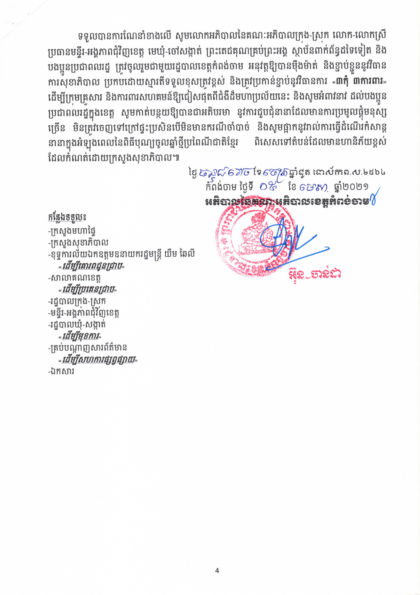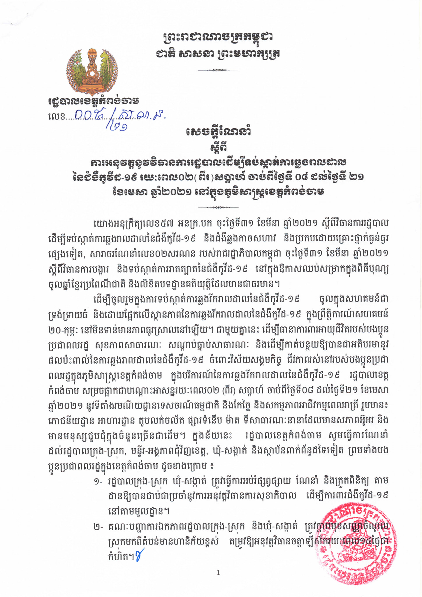 ខេត្តកំពង់ចាម៖ តាមការចុះផ្សាយរបស់ រដ្ឋបាលខេត្តកំពង់ចាម បានចេញសេចក្តីណែនាំ ស្តីពីការអនុវត្តនូវវិធានការរដ្ឋបាល ដើម្បីទប់ស្កាត់ការឆ្លងរាលដាលនៃជំងឺកូវីដ-១៩ រយៈពេល០២(ពីរ)សប្តាហ៍ ចាប់ពីថ្ងៃទី០៨ ដល់ថ្ងៃទី២១ ខែមេសា ឆ្នាំ២០២១ នៅខេត្តកំពង់ចាម ដើម្បីទប់ស្កាត់ឆ្លងរាលដាលនៃជំងឺកូវីដ-១៩ និងជំងឺឆ្លងកាចសាហាវ និងប្រកបដោយគ្រោះថ្នាក់ធ្ងន់ធរផ្សេងទៀត នៅក្នុងឱកាសឈប់សម្រាកក្នុងពិធីបុណ្យចូលឆ្នាំខ្មែរប្រពៃណីជាតិ និងលិខិតបទដ្ឋានគតិយុត្តិដែលមានជាធរមាន។