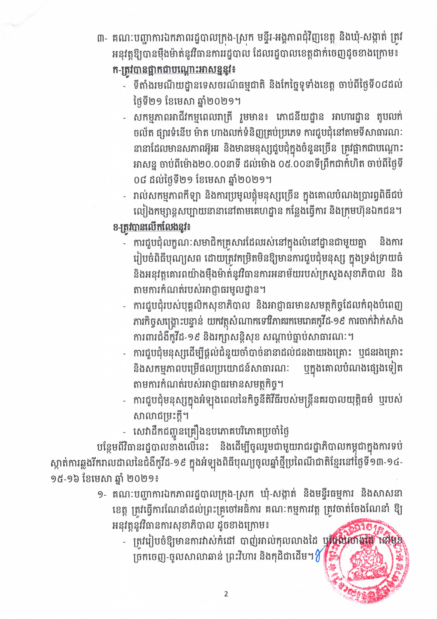 ជាមួយគ្នានេះ ដើម្បីធានាការពារអាយុជីវិតរបស់បងប្អូនប្រជាពលរដ្ឋ សុខាភាពសាធារណៈ សណ្ដាប់ធ្នាប់សាធារណៈ និងដើម្បីកាត់បន្ថយឲ្យបានជាអតិបរមានូវផលប៉ះពាល់នៃការឆ្លងរាលដាលនៃជំងឺកូវីដ-១៩ ចំពោះវិស័យសង្គមកិច្ច ជីវភាពរស់នៅរបស់បងប្អូនប្រជាពលរដ្ឋក្នុងភូមិសាស្ត្រខេត្តកំពង់ចាម ដោយរដ្ឋបាលខេត្តកំពង់ចាម បានសម្រេចផ្អាកបណ្ដោះអាសន្នរយៈពេល០២ សប្តាហ៍ ចាប់ពីថ្ងៃទី០៨ ដល់ថ្ងៃទី២១ ខែមេសា ឆ្នាំ២០២១ នូវទីតាំងរមណីយដ្ឋានទេសចរណ៍ធម្មជាតិ និងកែច្នៃទូទាំងខេត្ត និងសកម្មភាពជីវកម្មពេលរាត្រី រួមមាន៖ ភោជនីយដ្ឋាន អាហារដ្ឋាន តូបលក់ចល័ត ផ្សារទំនើប ម៉ាត ទីសាធារណៈនានាដែលមានសភាពអ៊ូអរ និងមានមនុស្សរដ្ឋបាលក្រុង-ស្រុក, មន្ទីរ-អង្គភាពជុំវិញខេត្ត, ឃុំឥសង្កាត់ និងស្ថាប័នពាក់ព័ន្ធដទៃទៀត ព្រមទាំងបងប្អូនប្រជាពលរដ្ឋក្នុងខេត្តកំពង់ចាម ដូចខាងក្រោម៖