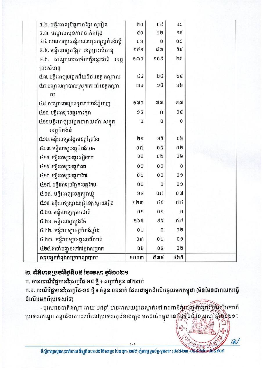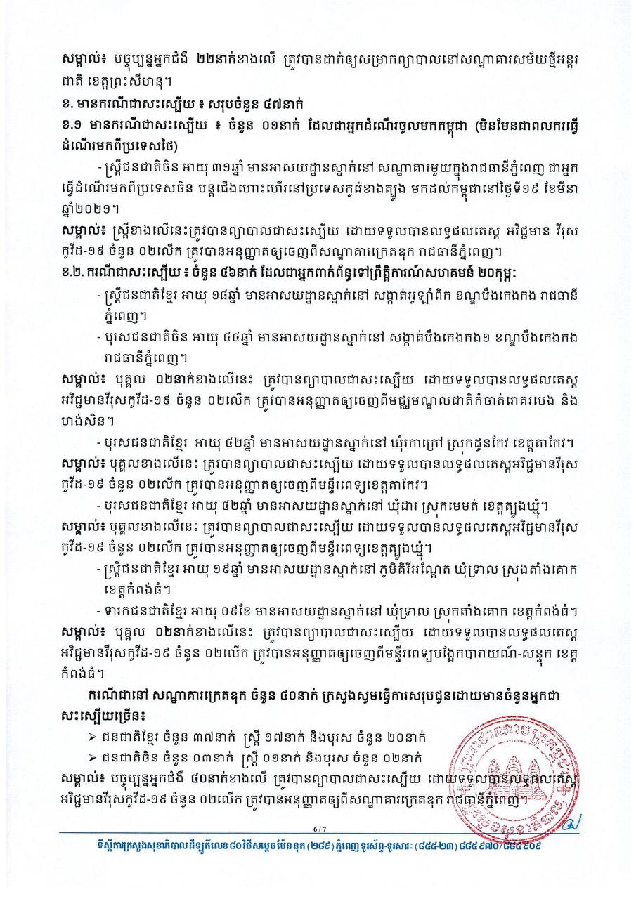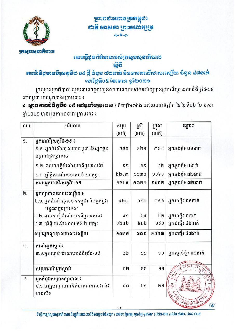 នៅព្រឹកថ្ងៃទី០៦ ខែមេសា ឆ្នាំ២០២១នេះ ក្រសួងសុខាភិបាលកម្ពុជា បានចេញសេចក្តីជូនដំណឹងពី ការរកឃើញករណីវិជ្ជមានវីរុសកូវីដ១៩ថ្មី ចំនួន ៧២នាក់ និងមានករណីជាសះស្បើយថ្មីចំនួន ៤៧នាក់ផងដែរ។ យោងតាមសេចក្តីប្រកាសរបស់ក្រសួងសុខាភិបាល បានបញ្ជាក់ថា អ្នកវិជ្ជមានទាំង ៧២នាក់នោះ គឺ ០១នាក់ជាអ្នកដំណើរចូលមកកម្ពុជា និង៧១នាក់ទៀតជាអ្នកពាក់ព័ន្ធព្រឹត្តិការណ៍ សហគមន៍២០កុម្ភៈ។