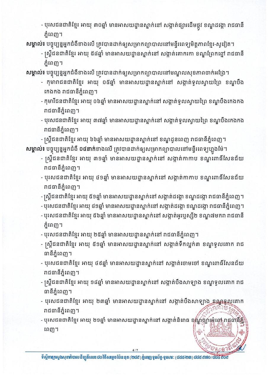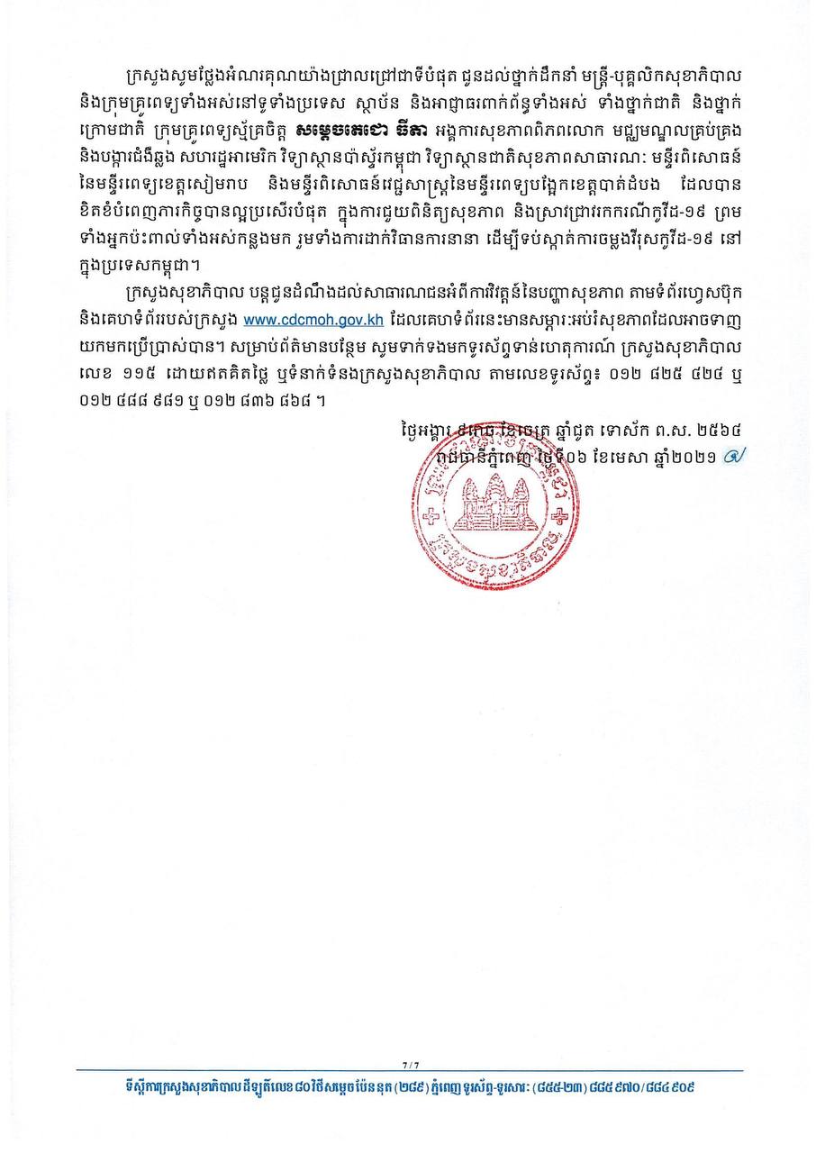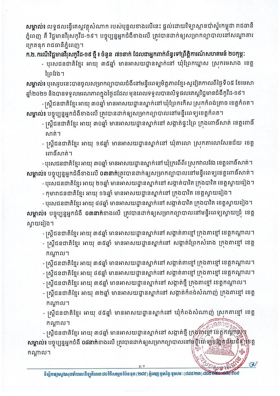 នៅព្រឹកថ្ងៃទី០៦ ខែមេសា ឆ្នាំ២០២១នេះ ក្រសួងសុខាភិបាលកម្ពុជា បានចេញសេចក្តីជូនដំណឹងពី ការរកឃើញករណីវិជ្ជមានវីរុសកូវីដ១៩ថ្មី ចំនួន ៧២នាក់ និងមានករណីជាសះស្បើយថ្មីចំនួន ៤៧នាក់ផងដែរ។ យោងតាមសេចក្តីប្រកាសរបស់ក្រសួងសុខាភិបាល បានបញ្ជាក់ថា អ្នកវិជ្ជមានទាំង ៧២នាក់នោះ គឺ ០១នាក់ជាអ្នកដំណើរចូលមកកម្ពុជា និង៧១នាក់ទៀតជាអ្នកពាក់ព័ន្ធព្រឹត្តិការណ៍ សហគមន៍២០កុម្ភៈ។