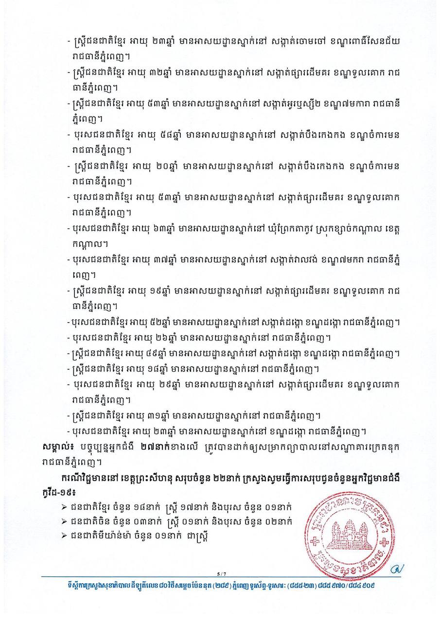 អ្វីដែលជាគួរកត់សំគាល់គឺមានបុរសជនជាតិខ្មែរម្នាក់ អាយុ៣៥ឆ្នាំ មានអាសយដ្ឋានស្នាក់នៅ ឃុំព្រែកឃ្នាស ស្រុកមេសាង ខេត្តព្រៃវែង បានចូលសម្រាកព្យាបាលជំងឺនៅមន្ទីរពេទ្យមិត្តភាពខ្មែរ-សូវៀត កាលពីថ្ងៃទី០៥ ខែមេសា ឆ្នាំ២០២១ ហើយបានទទួលមរណភាពនៅក្នុងថ្ងៃដដែល មុនពេលទទួលបានលទ្ធផលតេស្ត។ ក្រោយទទួលបានលទ្ធផលតេស្តបានរកឃើញថា បុរសដែលទទួលមរណភាពខាងលើគឺមានវិជ្ជមានកូវីដ-១៩៕