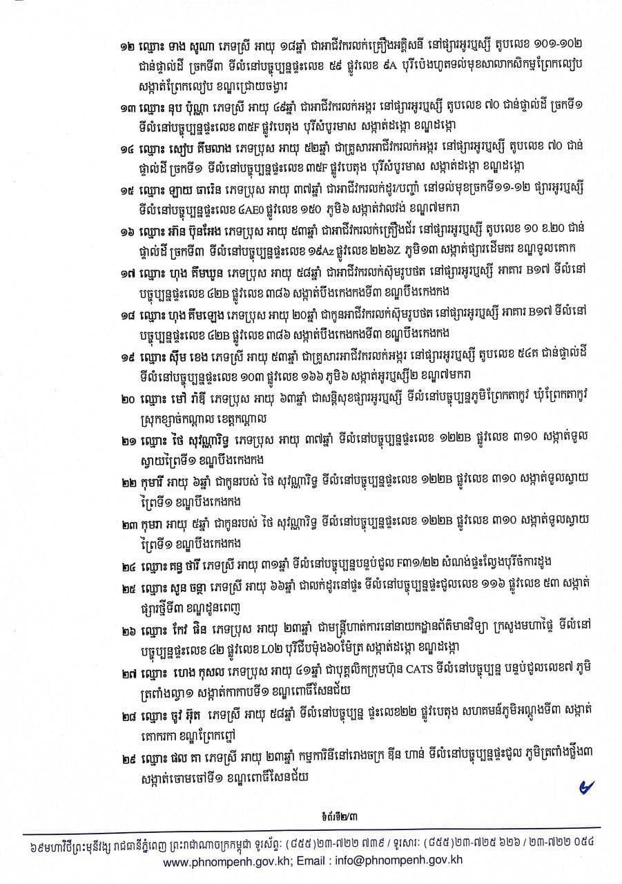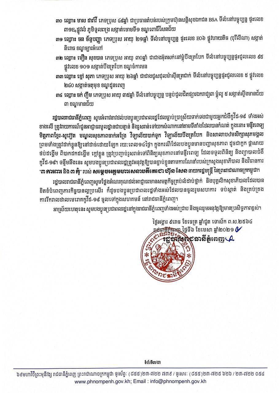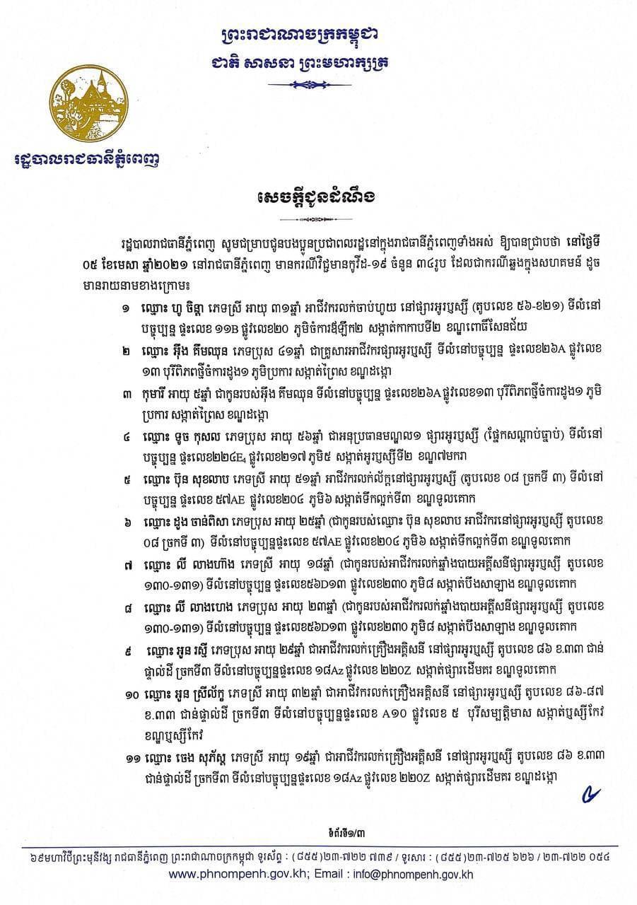រដ្ឋបាលរាជធានីភ្នំពេញ បង្ហាញអត្តសញ្ញាណអ្នកកើតកូវីដទាំង៣៤នាក់នៅភ្នំពេញ