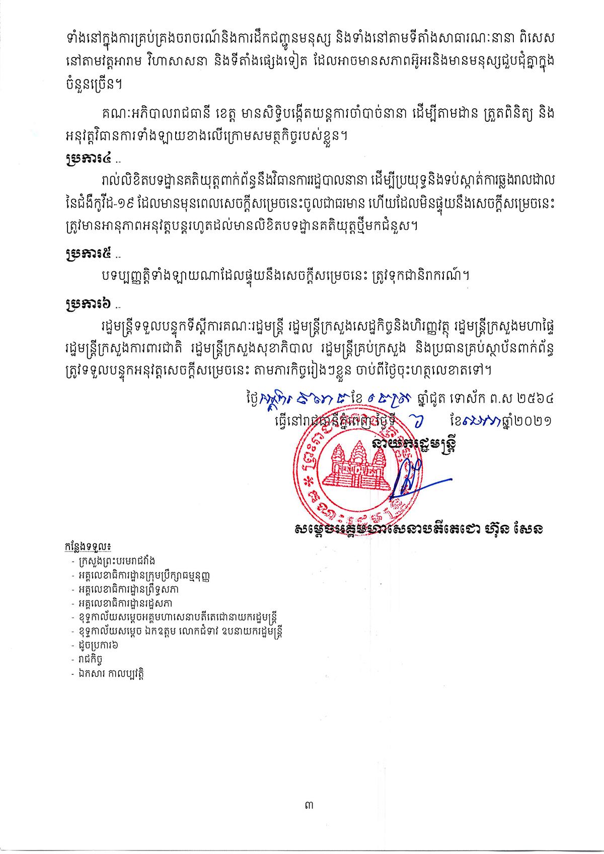 យោងតាមលិខិតរបស់រាជរដ្ឋាភិបាលកម្ពុជា បានសម្រេចធ្វើការហាមឃាត់ការធ្វើដំណើរឆ្លងកាត់ ចេញ-ចូល ពីខេត្តមួយទៅខេត្តមួយជាបណ្តោះអាសន្ន សម្រាប់រយៈពេល១៤ថ្ងៃ គិតចាប់ពីម៉ោងសូន្យថ្ងៃទី០៧ ខែមេសា ឆ្នាំ២០២១ រហូតដល់ថ្ងៃទី២០ ខែមេសា ឆ្នាំ២០២១ ក្នុងគោលបំណងប្រយុទ្ធនិងទប់ស្កាត់ការឆ្លងរាលដាលនៃជំងឺកូវីដ១៩ ពីភូមិសាស្ត្រនៃខេត្តមួយទៅភូមិសាស្ត្រនៃខេត្តមួយទៀត។
