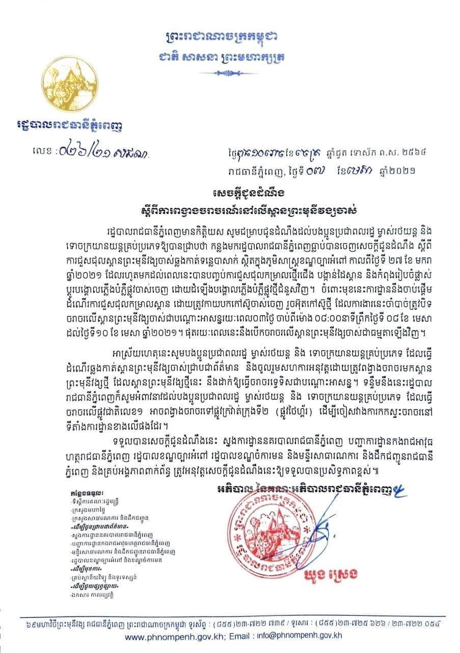 រដ្ឋបាលរាជធានីភ្នំពេញ បិទស្ពានព្រះមុនីវង្សចាស់ចំនួន ៣ថ្ងៃ ចាប់ពីម៉ោង ៨:០០ព្រឹកថ្ងៃទី៨ខែមេសា ដល់ថ្ងៃទី១០ខែមេសាឆ្នាំ២០២១ ដើម្បីធ្វើការជួសជុល ដោយពង្វាងចរាចរទៅមកលើស្ពានព្រះមុនីវង្សថ្មី។ សូមបងប្អូនអានសេចក្តីជូនដំណឹង ស្តីពីការពង្វាងចរាចរណ៍នៅលើស្ពានព្រះមុនីវង្សចាស់ខាងក្រោមនេះ៖