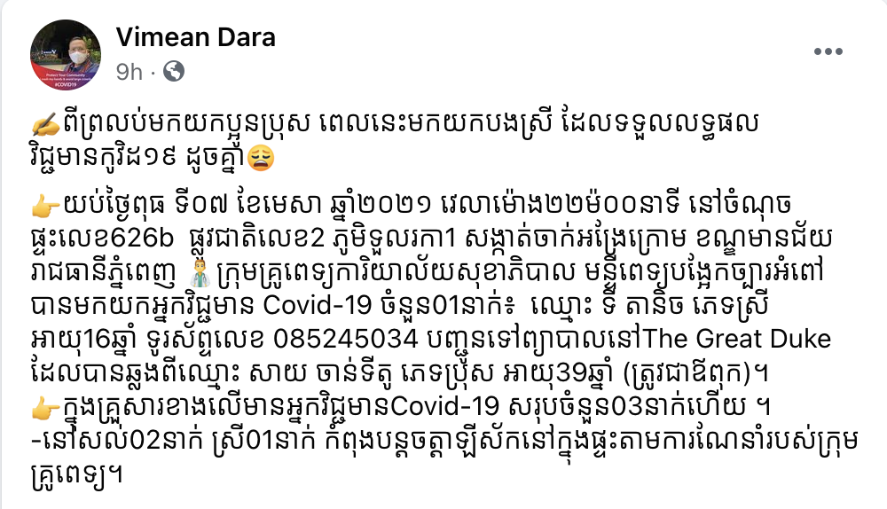 យោងតាមការបញ្ជាក់ពី លោក ម៉េង វិមានតារា អធិការនគរបាលខណ្ឌមានជ័យ បានឲ្យដឹងថា ពីព្រលប់មកយកប្អូនប្រុស ពេលនេះមកយកបងស្រី ដែលទទួលលទ្ធផលវិជ្ជមានកូវិដ១៩ ដូចគ្នា។ យប់ថ្ងៃពុធ ទី០៧ ខែមេសា ឆ្នាំ២០២១ វេលាម៉ោង២២ម៉០០នាទី នៅចំណុច ផ្ទះលេខ626b ផ្លូវជាតិលេខ2 ភូមិទួលរកា1 សង្កាត់ចាក់អង្រែក្រោម ខណ្ឌមានជ័យ រាជធានីភ្នំពេញ ក្រុមគ្រូពេទ្យការិយាល័យសុខាភិបាល មន្ទីពេទ្យបង្អែកច្បារអំពៅ បានមកយកអ្នកវិជ្ជមាន Covid-19 ចំនួន01នាក់៖ ឈ្មោះ ទី តានិច ភេទស្រី អាយុ16ឆ្នាំ ទូរស័ព្ទលេខ 085245034 បញ្ជូនទៅព្យាបាលនៅThe Great Duke ដែលបានឆ្លងពីឈ្មោះ សាយ ចាន់ទីតូ ភេទប្រុស អាយុ39ឆ្នាំ (ត្រូវជាឪពុក)។
