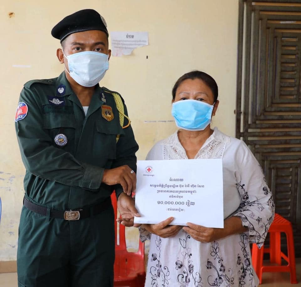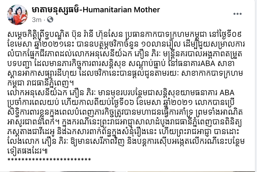 យោងតាមការបញ្ជាក់នៅលើហ្វេសប៊ុករបស់ មាតាមនុស្សធម៌ បានឲ្យដឹងថា សម្តេចកិត្តិព្រឹទ្ធបណ្ឌិត ប៊ុន រ៉ានី ហ៊ុនសែន ប្រធានកាកបាទក្រហមកម្ពុជា នៅថ្ងៃទី០៩ ខែមេសា ឆ្នាំ២០២១នេះ បានឧបត្ថម្ភថវិកាចំនួន ១០លានរៀល ដើម្បីជួយសម្រាលការលំបាកផ្នែកជីវភាពដល់លោកអនុសេនីយ៍ឯក ភឿន ភិរៈ មន្ត្រីនគរបាលអង្គភាពតម្រួតបទបញ្ជា ដែលមានភារកិច្ចការពារសន្តិសុខ សណ្តាប់ធ្នាប់ នៅធនាគារABA សាខាស្ពានអាកាសផ្សារដីហុយ ដែលថវិកានេះបានផ្តល់ជូនតាមរយៈ សាខាកាកបាទក្រហមកម្ពុជា រាជធានីភ្នំពេញ។