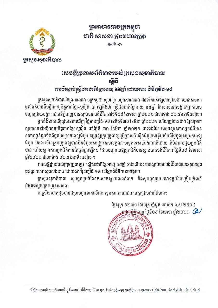 នៅមុននេះបន្តិច ក្រសួងសុខាភិបាលបានចេញសេចក្តីជូនព័ត៌មានមួយស្តីពីការស្លាប់អ្នកជំងឺម្នាក់ជាជនជាតិខ្មែរ អាយុ៥៥ឆ្នាំ ដោយសារជំងឺកូវីដ-១៩ នៅមន្ទីរពេទ្យមិត្តភាពខ្មែរ-សូវៀត នៅថ្ងៃទី០៩ ខែមេសា ឆ្នាំ២០២១ វេលាម៉ោង ០២:៥៦នាទីរសៀល។