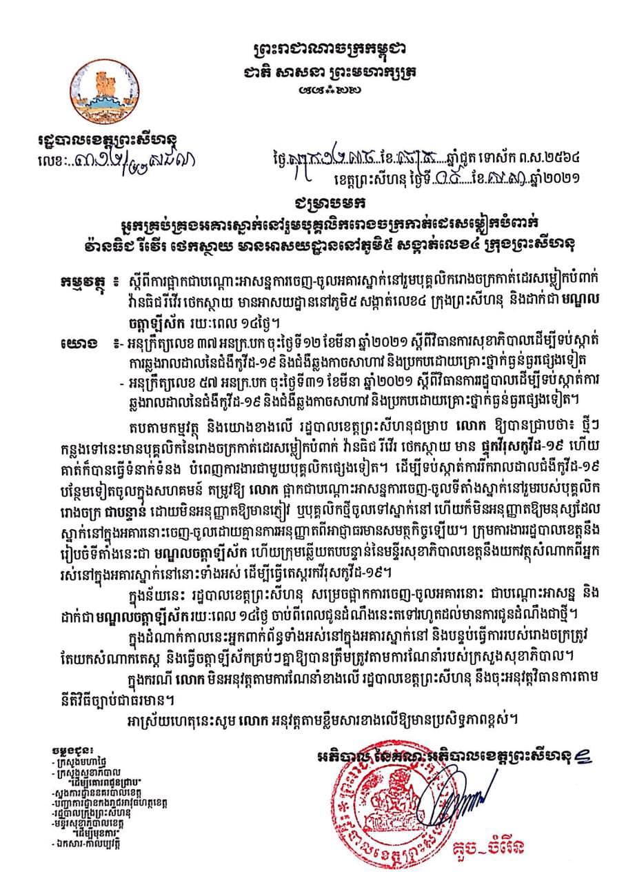 យោងតាមលិខិតមួយច្បាប់របស់រដ្ឋបាលខេត្តព្រះសីហនុ បានធ្វើការជម្រាបជូនទៅអ្នកគ្រប់គ្រង់អគារស្នាក់នៅរួមបុគ្គលិករោងចក្រកាត់ដេរសម្លៀកបំពាក់ វ៉ានធិជ រីវើរ ថេកស្ថាយ មានអាសយដ្ឋាននៅភូមិ៥ សង្កាត់លេខ៤ ក្រុងព្រះសីហនុ អោយធ្វើការផ្អាកបណ្តោះអាសន្នការចេញ-ចូលចំពោះអគារស្នាក់នៅរួមបុគ្គលិករោងចក្រ និងដាក់ជាមណ្ឌលចត្តាឡីស័ករយៈពេល១៤ថ្ងៃ។