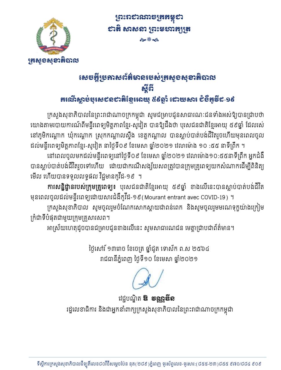 យោងតាមការបញ្ជាក់ពី ក្រសួងសុខាភិបាល បានឲ្យដឹងថា បុរសជនជាតិខ្មែរ អាយុ៥៩ឆ្នាំ ដែលរស់នៅភូមិកណ្តោក ឃុំកណ្តោក ស្រុកកណ្តាលស្ទឹង ខេត្តកណ្តាល បានស្លាប់បាត់បង់ជីវិតរួចហើយមុនពេលចូលដល់មន្ទីរពេទ្យមិត្តភាពខ្មែរ-សូវៀត នាថ្ងៃទី០៩ ខែមេសា ឆ្នាំ២០២១ វេលាម៉ោង ១០ និង៥៥នាទីព្រឹក។