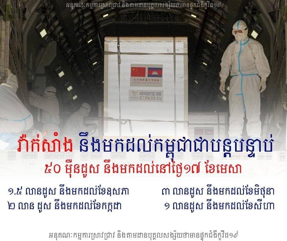 «នៅថ្ងៃទី១៧ ខែមេសា នឹងមកដល់ចំនួន៥សែនដូស, ខែឧសភា នឹងមកដល់ចំនួន១លាន៥សែនដូស, ខែមិថុនា នឹងមកដល់ចំនួន៣លានដូស, ខែកក្កដា នឹងមកដល់២លានដូស, ខែសីហា នឹងមកដល់១លានដូស ដូច្នេះវ៉ាក់សាំងរបស់យើងអាចបម្រើការចាក់បាន»។