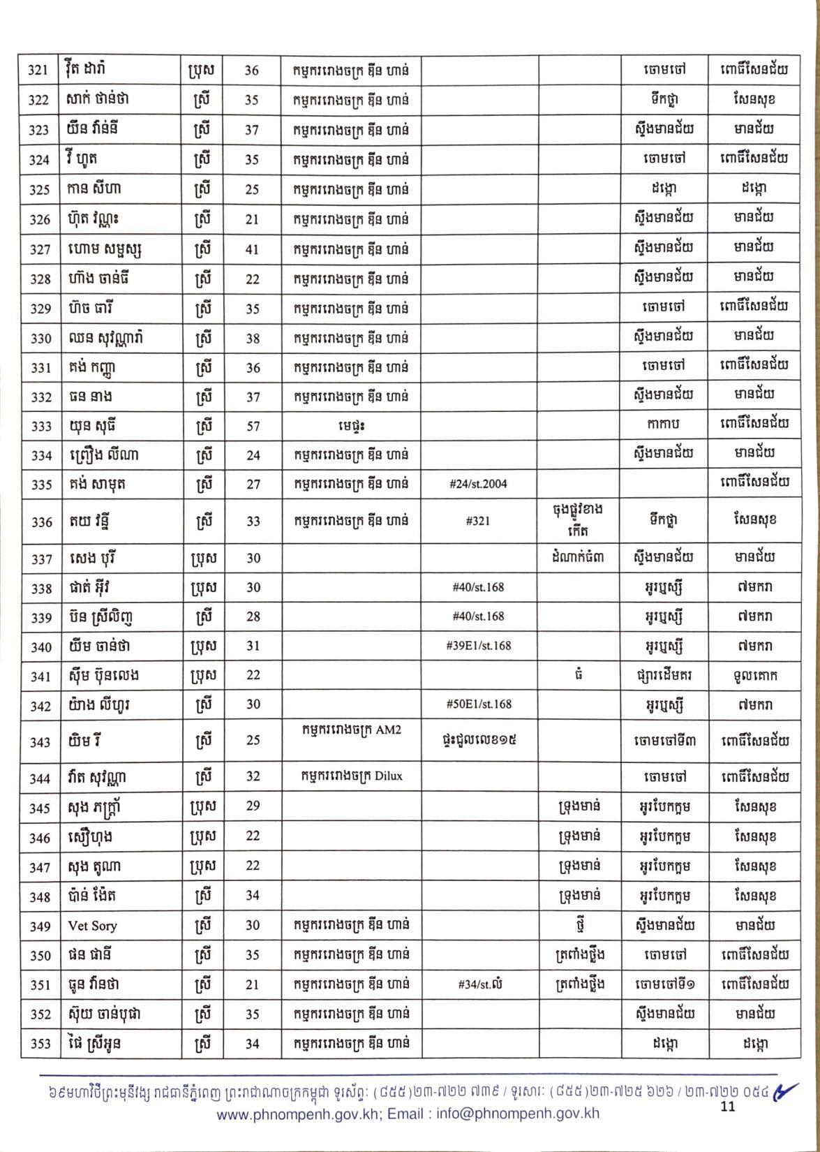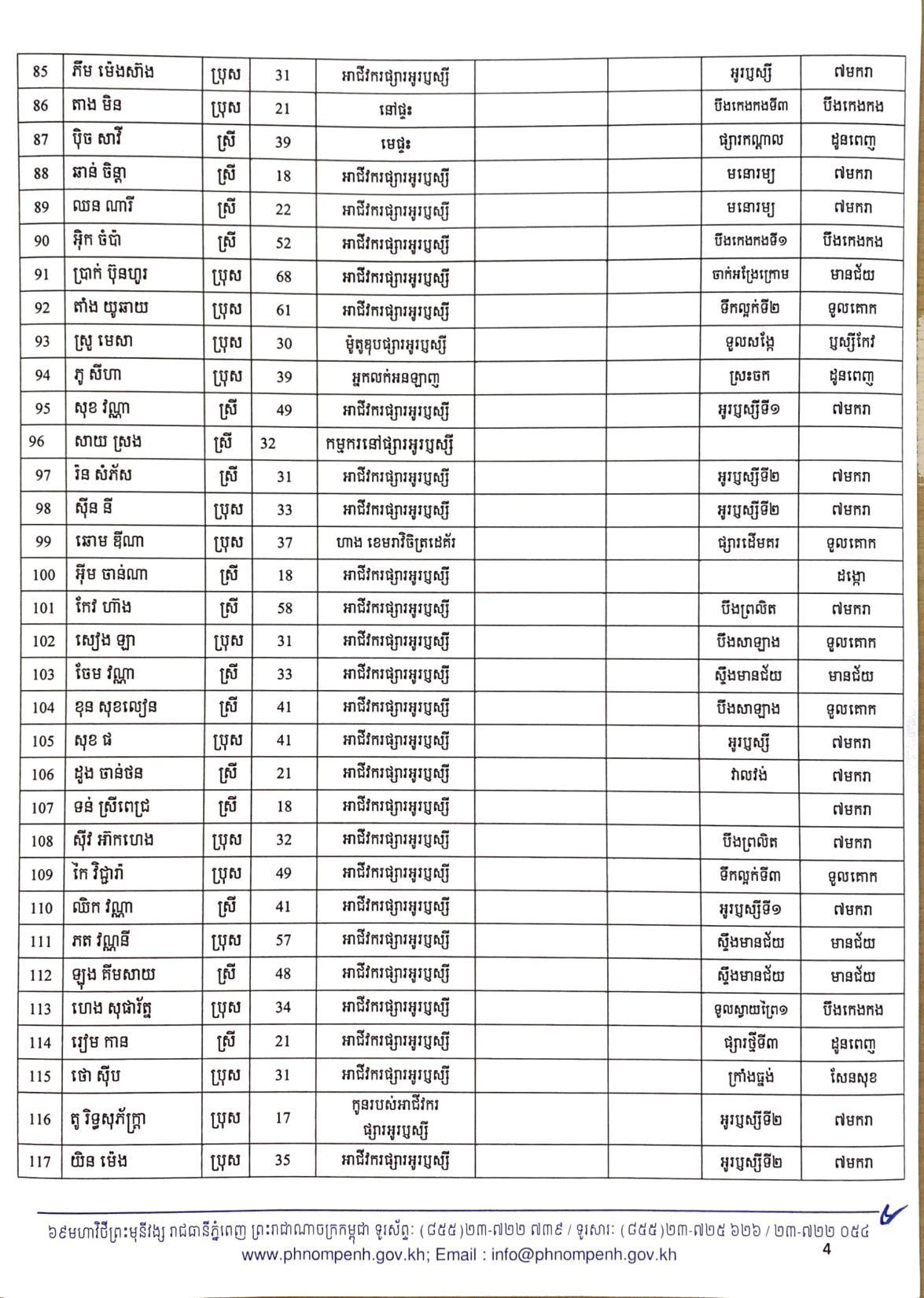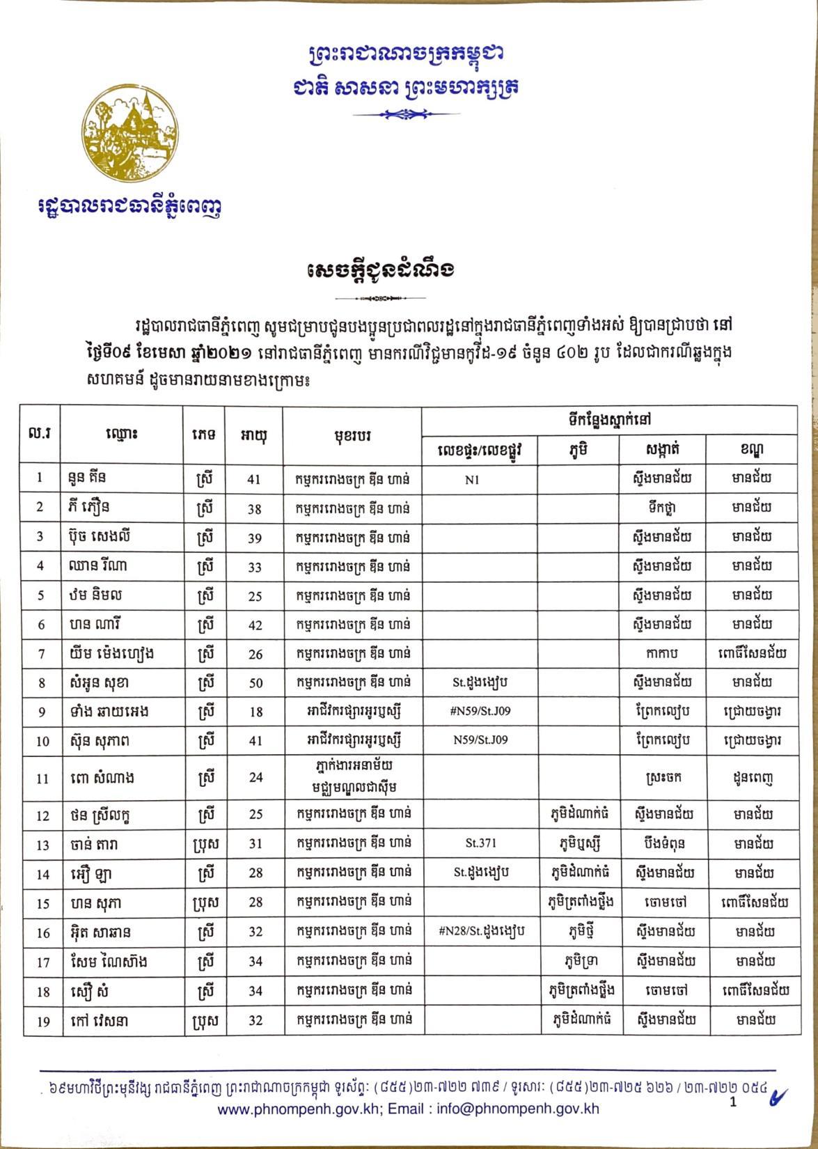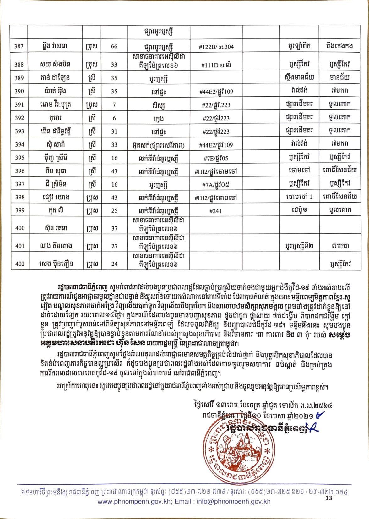 យោងតាមលិខិតរបស់ រដ្ឋបាលរាជធានីភ្នំពេញ បានធ្វើការបង្ហាញអត្តសញ្ញាណអ្នកវិជ្ជមានកូវីដ១៩ ទាំង៤០២នាក់នៅក្នុងរាជធានីភ្នំពេញ ក្នុងនោះមានអាជីវករ ដែលលក់ដូរនៅក្នុងផ្សារអូរឬស្សីជាច្រើនកន្លែងចំនួន៦៧នាក់ផងដែរ៕