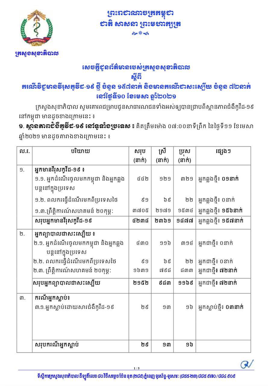 នៅព្រឹកថ្ងៃទី១១ ខែមេសា ឆ្នាំ២០២១នេះ ក្រសួងសុខាភិបាលកម្ពុជា បានចេញសេចក្តីជូនដំណឹងពី ការរកឃើញករណីវិជ្ជមានវីរុសកូវីដ១៩ថ្មី ចំនួន ១៥៧នាក់ និងមានករណីជាសះស្បើយថ្មីចំនួន ៧២នាក់ផងដែរ។ យោងតាមសេចក្តីប្រកាសរបស់ក្រសួងសុខាភិបាល បានបញ្ជាក់ថា អ្នកវិជ្ជមានទាំង ១៥៧នាក់នោះ គឺ មាន១នាក់ជាអ្នកដំណើរចូលមកកម្ពុជា និង១៥៦នាក់ទៀត ជាអ្នកពាក់ព័ន្ធព្រឹត្តិការណ៍ សហគមន៍២០កុម្ភៈ។