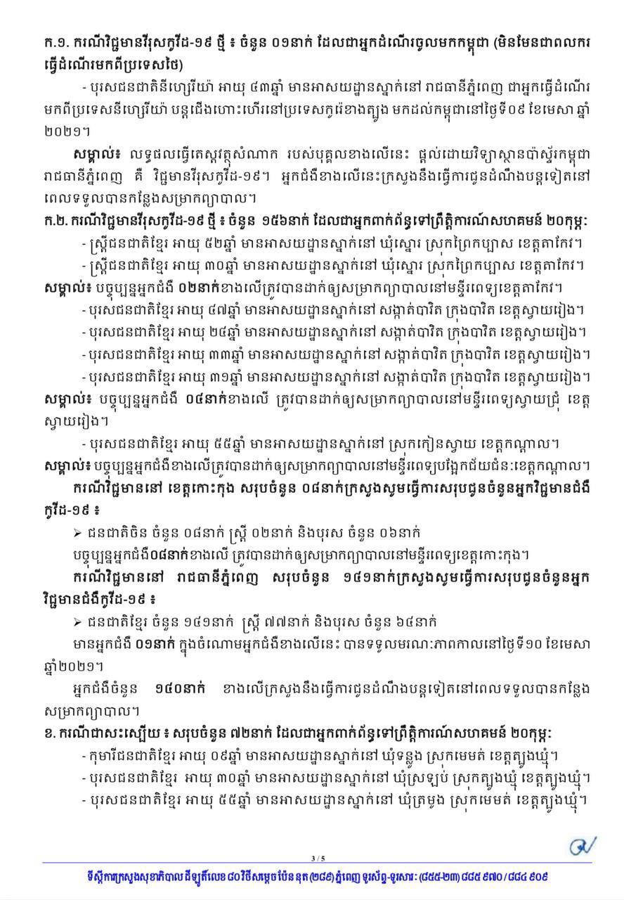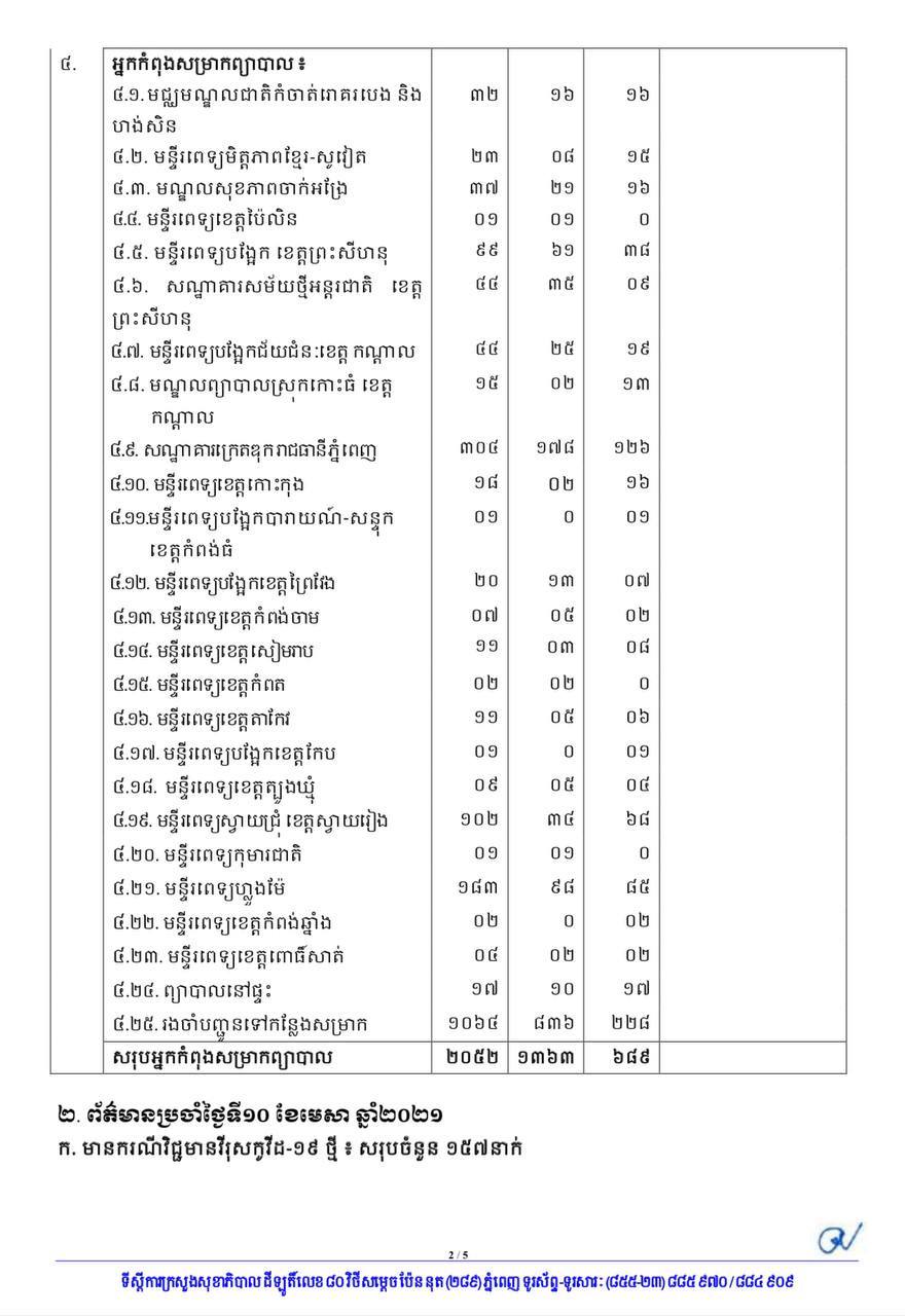 យោងតាមការបញ្ជាក់ពី ក្រសួងសុខាភិបាលបានឲ្យដឹងថា ក្នុងចំណោមអ្នកឆ្លងថ្មីទាំង ១៥៧នាក់ នៅរាជធានីភ្នំពេញមានចំនួនសរុប ១៤១នាក់ ដែលមានស្ត្រី ៧៧នាក់ និងបុរស ៦៤នាក់។ មានអ្នកជំងឺ ១នាក់ ក្នុងចំណោមអ្នកជំងឺខាងលើនេះ បានទទួលមរណៈភាពកាលពីថ្ងៃទី១០ ខែមេសា ឆ្នាំ២០២១៕