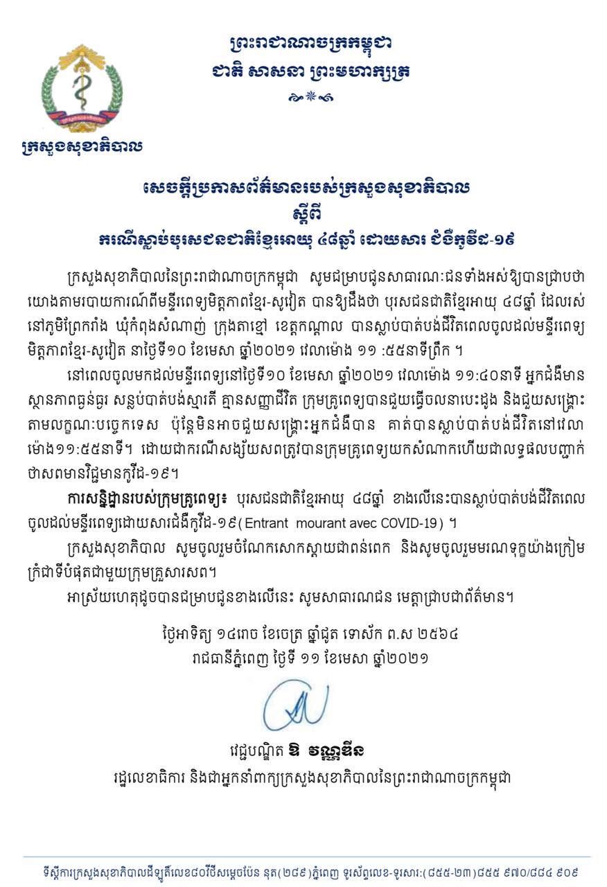២- បុរសជនជាតិខ្មែរ អាយុ៤៨ឆ្នាំ ដែលរស់នៅភូមិព្រែករាំង ឃុំកំពុងសំណាញ់ ក្រុងតាខ្មៅ ខេត្តកណ្តាល បានស្លាប់បាត់បង់ជីវិតពេលចូលដល់មន្ទីរពេទ្យមិត្តភាពខ្មែរ-សូវៀត ដោយសារជំងឺកូវីដ១៩ នាថ្ងៃទី១០ ខែមេសា ឆ្នាំ២០២១ វេលាម៉ោង ១១ និង៥៥នាទីរសៀល។ សូមអានព័ត៌មានលំអិតខាងក្រោម៖