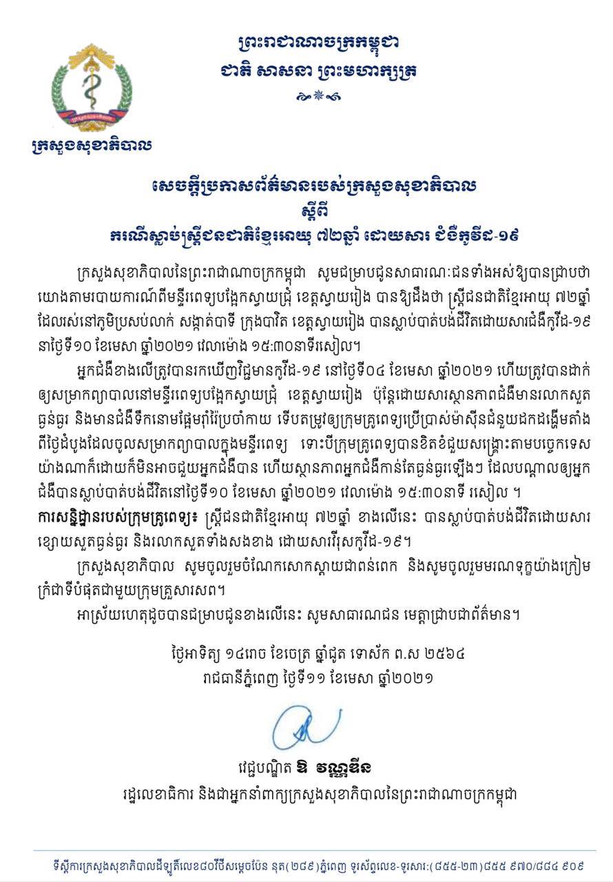 ១- ស្ត្រីជនជាតិខ្មែរ អាយុ៧២ឆ្នាំ ដែលរស់នៅភូមិប្រសប់លាក់ សង្កាត់បាទី ក្រុងបាវិត ខេត្តស្វាយរៀង បានស្លាប់បាត់បង់ជីវិត ដោយសារជំងឺកូវីដ១៩ នាថ្ងៃទី១០ ខែមេសា ឆ្នាំ២០២១ វេលាម៉ោង ១៥ និង៣០នាទីរសៀល