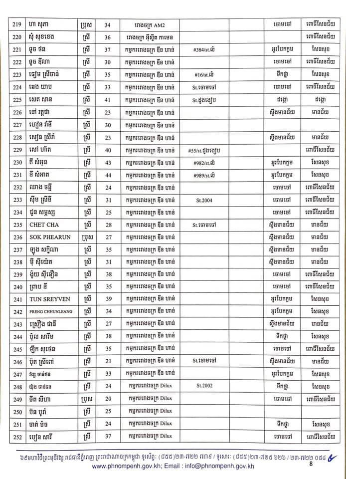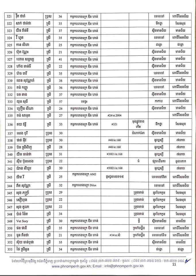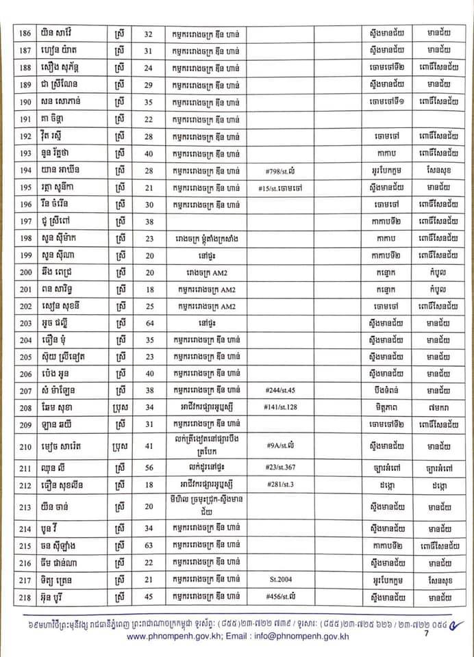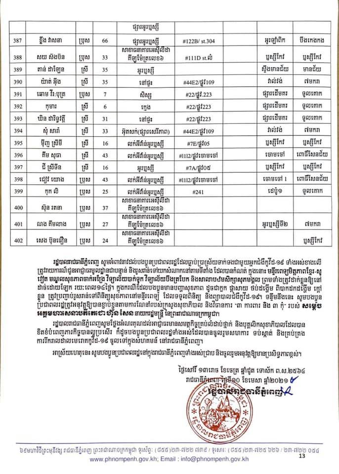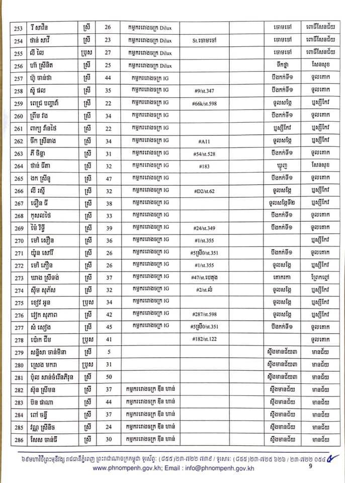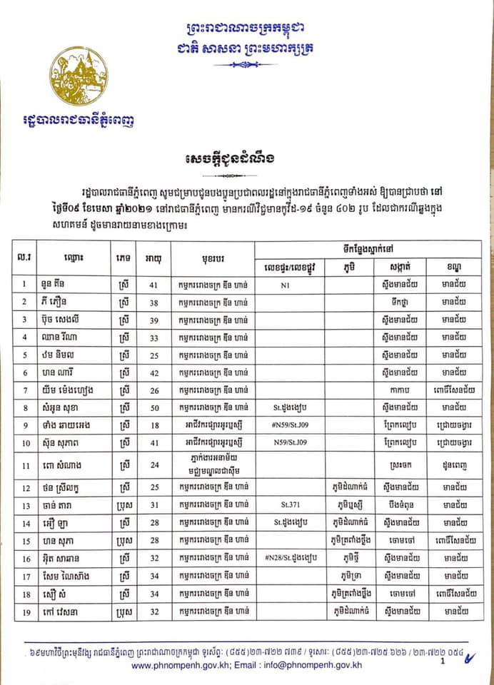កាលពីម្សិលមិញនេះដែររដ្ឋបាលរាជធានីភ្នំពេញបានចេញលិខិតស្តីពីការបង្ហាញអត្តសញ្ញាណអ្នកវិជ្ជមានកូវីដ-១៩ ចំនួន៤០២នាក់ដែលក្នុងនោះភាគច្រើនជាកម្មករ កម្មការិនីរោងចក្រ ឌីនហាន និងអាជីវករផ្សារអូរឫស្សី។