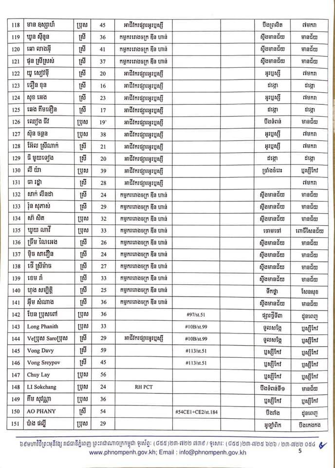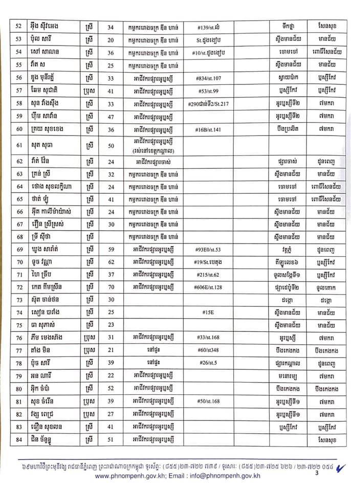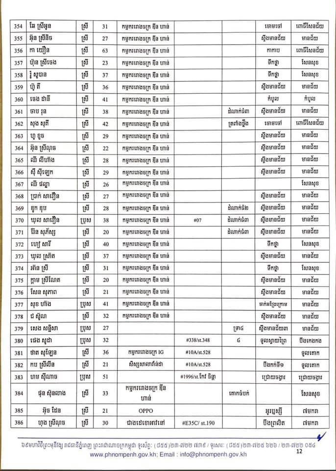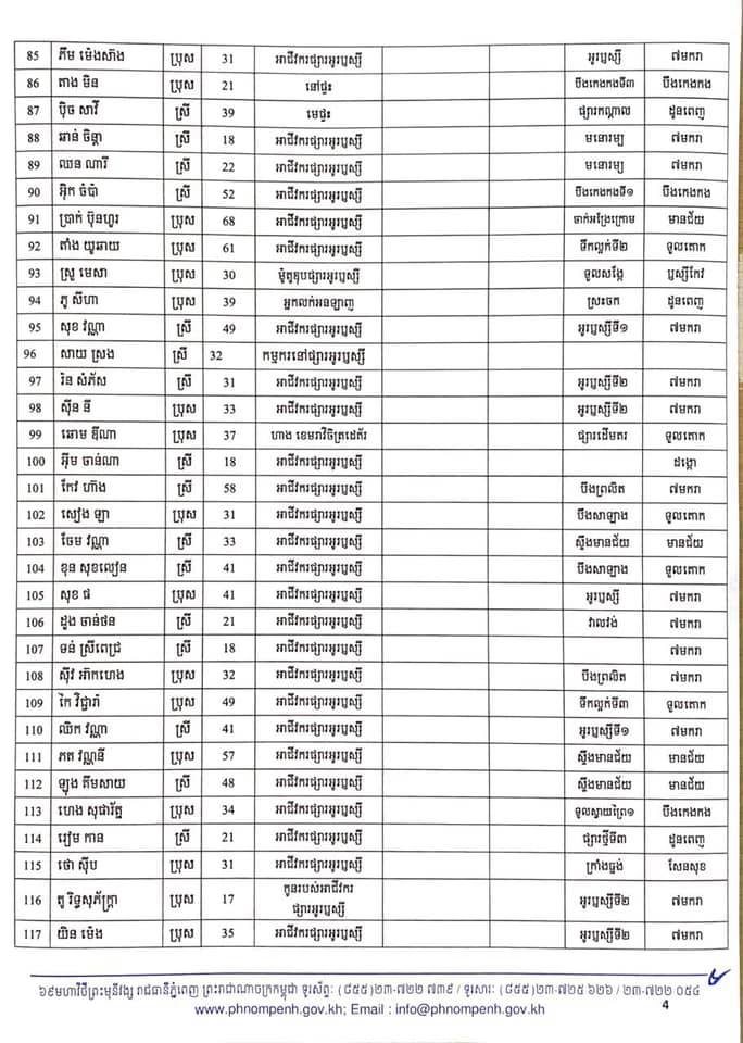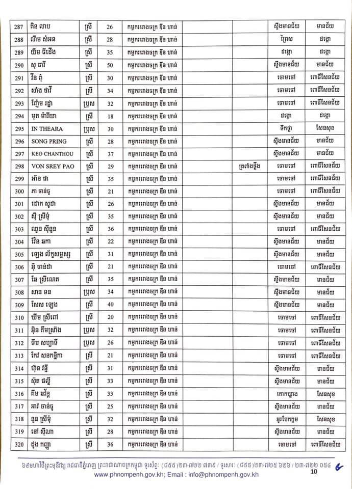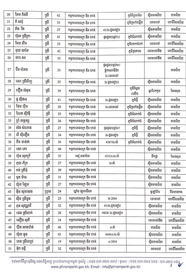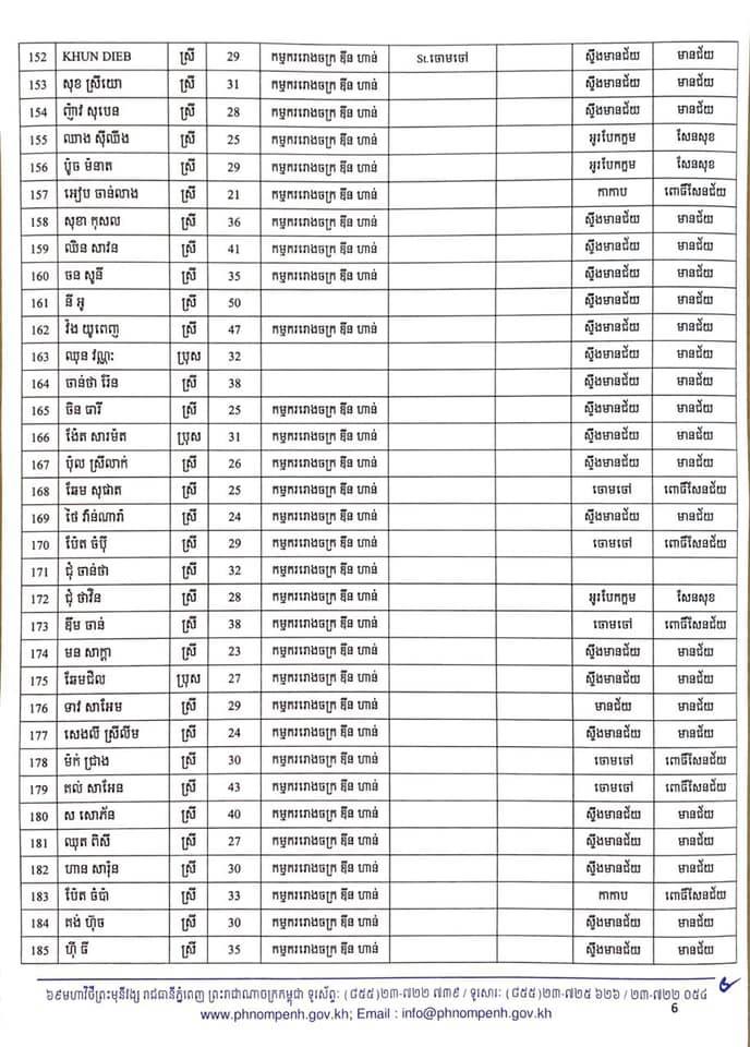 កាលពីម្សិលមិញនេះដែររដ្ឋបាលរាជធានីភ្នំពេញបានចេញលិខិតស្តីពីការបង្ហាញអត្តសញ្ញាណអ្នកវិជ្ជមានកូវីដ-១៩ ចំនួន៤០២នាក់ដែលក្នុងនោះភាគច្រើនជាកម្មករ កម្មការិនីរោងចក្រ ឌីនហាន និងអាជីវករផ្សារអូរឫស្សី។