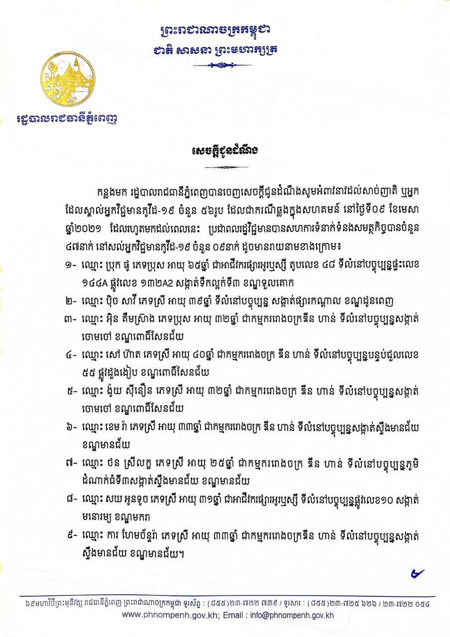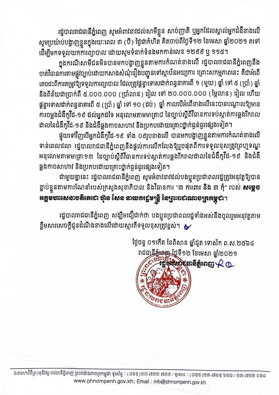 ក្នុងនោះដែររដ្ឋបាលរាជធានីភ្នំពេញបានដាក់កំហិតដល់អ្នកជំងឺទាំង៩នាក់នេះ ដោយត្រូវធ្វើការបង្ហាញខ្លួនជាបន្ទាន់ក្នុងរយៈពេល៣ថ្ងៃ ជាកំហិត គិតចាប់ពីថ្ងៃទី១២ ខែមេសា ឆ្នាំ២០២១ នេះតទៅ។ ក្នុងករណីសាមីជនមិនបានមកបង្ហាញខ្លួនតាមការកំណត់នោះទេ រដ្ឋបាលរាជធានីភ្នំពេញនឹងចាត់វិធានការតាមផ្លូវច្បាប់ដូចខាងក្រោម៕