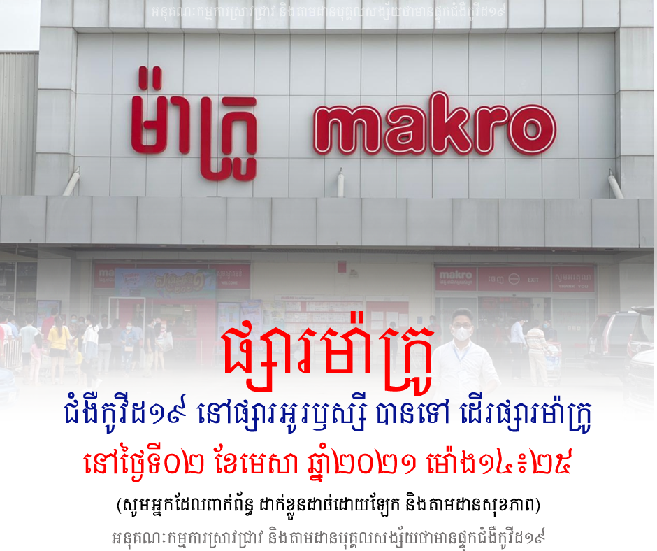 អនុគណៈកម្មការស្រាវជ្រាវ និងតាមដានបុគ្គលសង្ស័យថាមានផ្ទុកជំងឺកូវីដ១៩ នៅល្ងាចថ្ងៃទី១២ ខែមេសា ឆ្នាំ២០២១នេះ បានជូនដំណឹងនៅលើ Facebook ថា អ្នកកើតជំងឺកូវីដ១៩ ធ្លាប់បានទៅផ្សារទំនើបម៉ាក្រូ នៅវេលាម៉ោង២រសៀល ថ្ងៃទី០៤ ខែមេសា ឆ្នាំ២០២១កន្លងទៅ។
