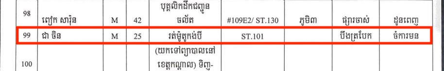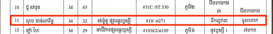 ៤- ឈ្មោះ ឈួន និត ភេទ ប្រុស ជាអ្នករត់ម៉ូតូឌុប ស្នាក់នៅ ផ្ទះជួល សង្កាត់ស្ទឹងមានជ័យ ខណ្ឌមានជ័យ