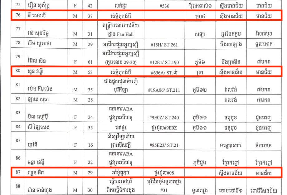 យោងតាមការបញ្ជាក់ពី រដ្ឋបាលរាជធានីភ្នំពេញ បានធ្វើការបង្ហាញអត្តសញ្ញាណអ្នកវិជ្ជមានទាំង១៩៨នាក់នៅក្នុងរាជធានីភ្នំពេញ ក្នុងនោះមានអ្នកវិជ្ជមានជាអ្នករត់ម៉ូតូឌុប និងរត់ម៉ូតូកង់៣ចំនួន៥នាក់៖