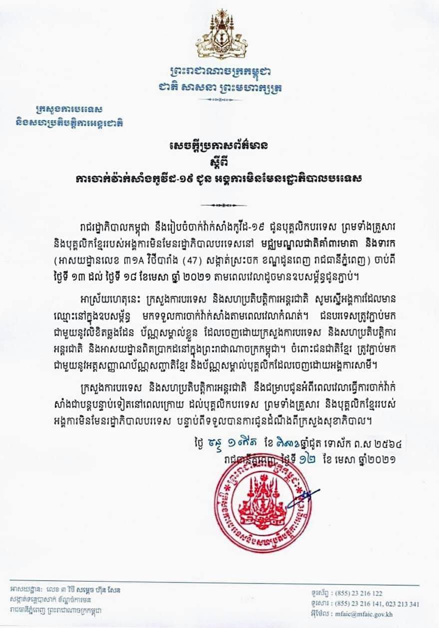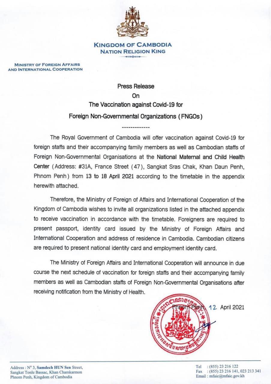 រាជធានីភ្នំពេញ៖ តាមការចុះផ្សាយរបស់ ក្រសួងការបរទេស និងសហប្រតិបត្តិការអង្គរជាតិ បានចេញសេចក្ដីប្រកាសព័ត៌មាន ស្ដីពីការចាក់វ៉ាក់សាំងកូវីដ-១៩ ជូនបុគ្គលិកបរទេស និងក្រុមគ្រួសារ ព្រមទាំងបុគ្គលិកខ្មែររបស់អង្គការមិនមែនរដ្ឋាភិបាលបរទេសនៅកម្ពុជានៅមជ្ឈមណ្ឌលជាតិគាំពារមាតា និងទារក(អាសយដ្ឋានលេខ ៣១A វិថីបារាំង (47) សង្កាត់ស្រះចក ខណ្ឌដូនពេញ រាជធានីភ្នំពេញ) ចាប់ពីថ្ងៃទី១៣ ដល់ថ្ងៃទី១៨ ខែមេសា ឆ្នាំ២០២១ តាមពេលវេលាដូចមានឧបសម្ព័ន្ធជូនភ្ជាប់។