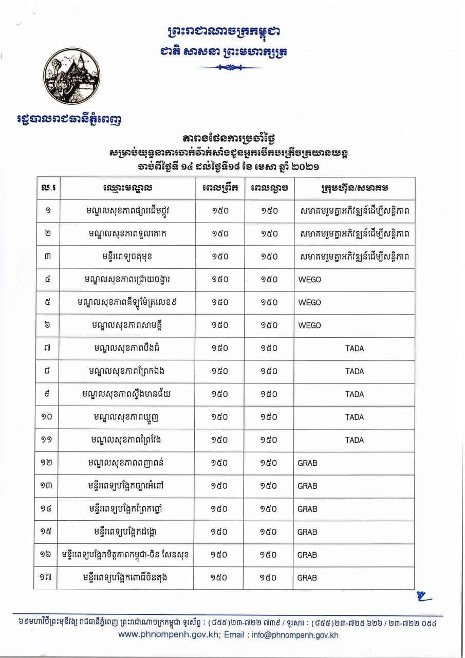 នាថ្ងៃទី១៣ ខែមេសា ឆ្នាំ២០២១នេះ រដ្ឋបាលរាជធានីភ្នំពេញ បានធ្វើការបង្ហាញពីទីតាំងចាក់វ៉ាក់សាំងជូនអ្នករត់ម៉ូតូកង់បី (ក្រុមហ៊ុន និងឯកជន) ពីថ្ងៃទី១៤-១៨ ខែមេសា ដែលមានសរុបចំនួន៣២នាក់ទីតាំង។