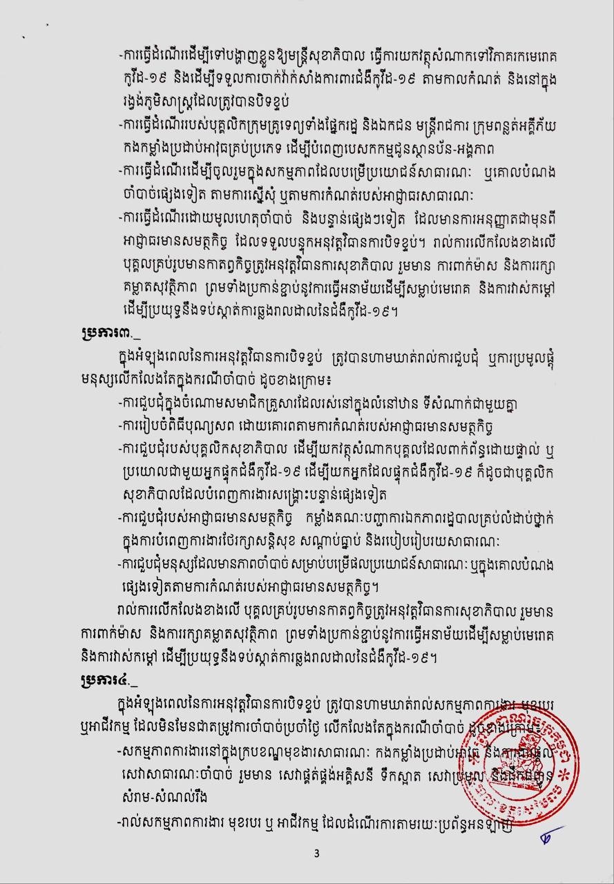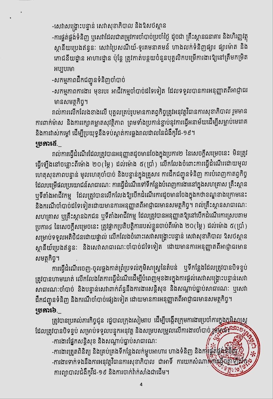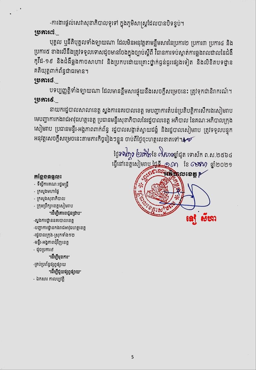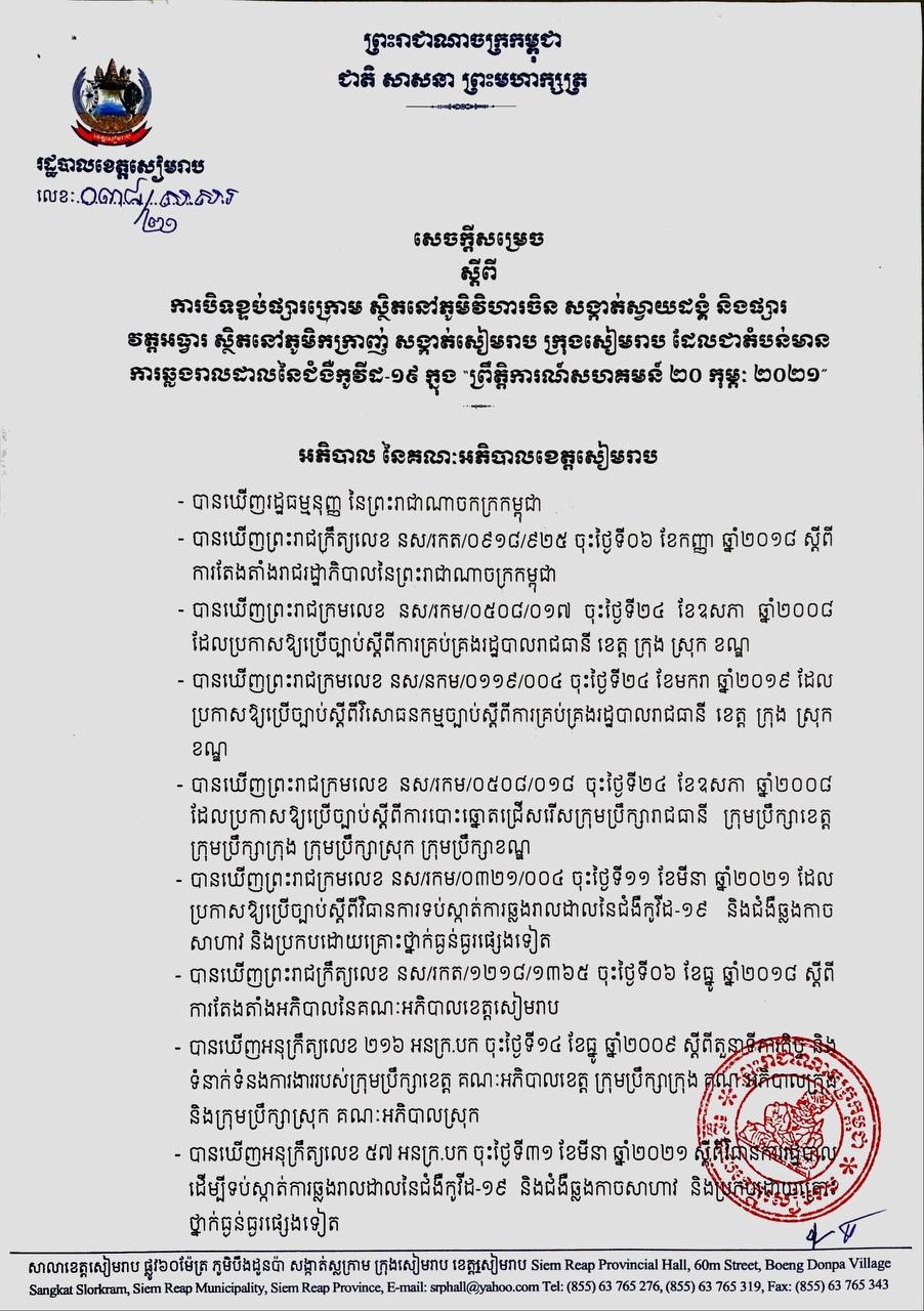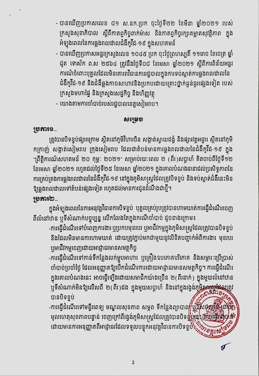 ខេត្តសៀមរាប៖ យោងតាមសារលិខិតរបស់ រដ្ឋបាលខេត្តសៀមរាប បានសម្រេចការបិទខ្ទប់ផ្សារក្រោម ស្ថិតនៅភូមិវិហារចិន សង្កាត់ស្វាយដង្គំ និងផ្សារ វត្តអធ្វារ ស្ថិតនៅភូមិកក្រាញ់ សង្កាត់សៀមរាប ក្រុងសៀមរាប ដែលជាតំបន់មាន ការឆ្លងរាលដាលនៃជំងឺកូវីដ-១៩ ក្នុង “ព្រឹត្តិការណ៍សហគមន៍ ២០កុម្ភៈ “២០២១ សម្រាប់រយៈពេល ២សប្តាហ៍ គិតចាប់ពីថ្ងៃទី១២ ខែមេសា ឆ្នាំ២០២១ រហូតដល់ថ្ងៃទី២៥ ខែមេសា ឆ្នាំ២០២១ ក្នុងគោលបំណងធានាដល់ប្រសិទ្ធភាពនៃការគ្រប់គ្រងការឆ្លងរាលដាលនៃជំងឺកូវីដ-១៩ ក្នុងភូមិសាស្ត្រដែលត្រូវបិទខ្ទប់ រហូតដល់មានការជូនដំណឹងជាថ្មី ព័ត៌មានលម្អិតសូមអានសេចក្តីសម្រេចដូចខាងក្រោម៖