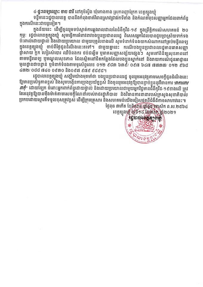 យោងតាមសេចក្តីជូនដំណឹងរបស់រដ្ឋបាលខេត្តត្បូងឃ្មុំ បាននឲ្យដឹងថា ករណីការឆ្លងរាលដាលនៃជំងឺកូវីដ១៩ ក្នុងព្រឹត្តិការណ៍សហគមន៍ ២០កុម្ភៈ ខេត្តត្បូងឃ្មុំបានរកឃើញអ្នកវិជ្ជមានកូវីដ១៩ លើស្ត្រីជាជនជាតិខ្មែរចំនួន ០១នាក់បន្ថែមទៀត នៅថ្ងៃទី១៣ ខែមេសា ឆ្នាំ២០២១ លើស្ត្រីមានអាយុ៣៦ឆ្នាំ រស់នៅភូមិកោងកាងទី១ ឃុំកោងកាង ស្រុកពញាក្រែក ខេត្តត្បូងឃ្មុំ។ សូមអានព័ត៌មានលំអិតខាងក្រោម៖