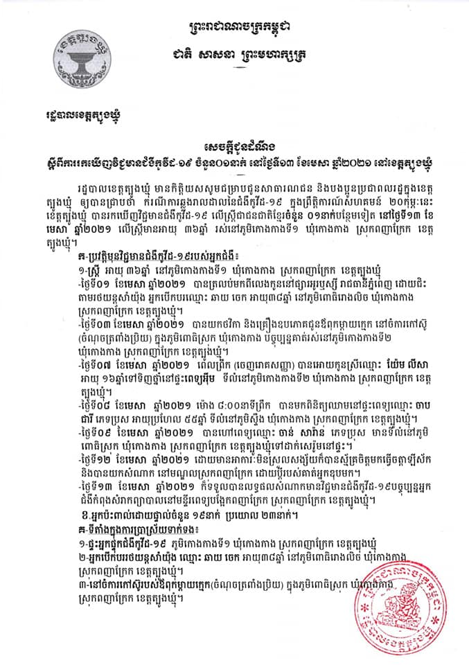 រដ្ឋបាលខេត្តត្បូងឃ្មុំ បញ្ជាក់ថា រកឃើញស្ត្រីវិជ្ជមានកូវីដ១៩ នៅស្រុកពញាក្រែក ដោយធ្លាប់ត្រលប់មកពីលេងកូននៅផ្សារអូរឬស្សី កាលពីថ្ងៃទី១ ខែមេសា