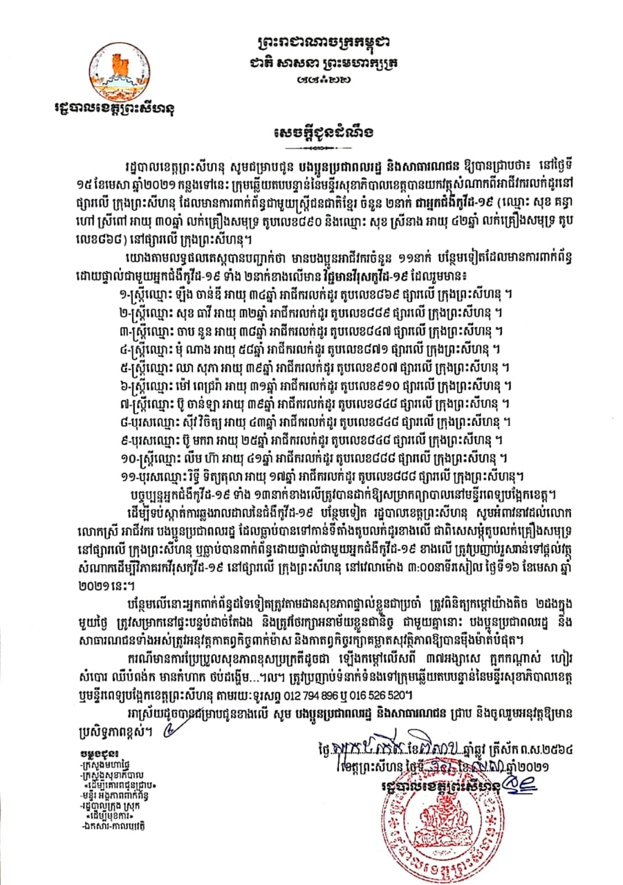 សូមអំពាវនាវដល់លោក-លោកស្រី អាជីវករ បងប្អូនប្រជាពលរដ្ឋ ដែលធ្លាប់បានទៅកាន់ទីតាំងតូបលក់ដូរ ជាពិសេសម្តុំតូបលក់គ្រឿងសមុទ្រនៅផ្សារលើ ក្រុងព្រះសីហនុ ឬធ្លាប់បានពាក់ព័ន្ធដោយផ្ទាល់ជាមួយអ្នកជំងឺកូវីដ-១៩ ខាងលើ ត្រូវប្រញាប់រួសរាន់ទៅផ្តល់វត្ថុសំណាកដើម្បីវិភាគរកវីរុសកូវីដ-១៩ នៅផ្សារលើ ក្រុងព្រះសីហនុ នៅវេលាម៉ោង ៣:០០នាទីរសៀល ថ្ងៃទី១៦ ខែមេសា ឆ្នាំ២០២១។