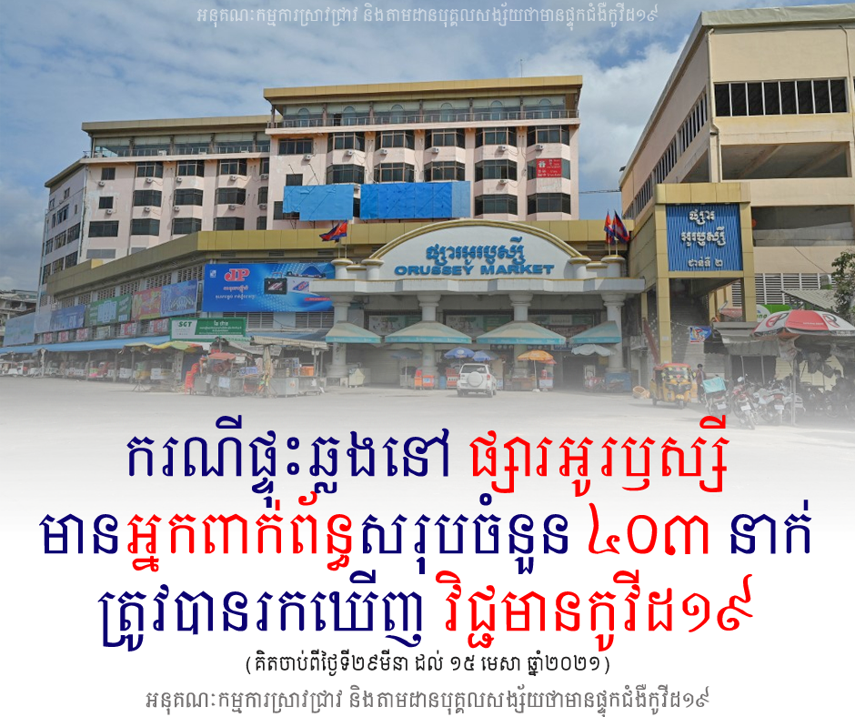 យោងតាមការបញ្ជាក់ពី អនុគណៈកម្មការស្រាវជ្រាវជំងឺកូវីដ១៩ បានឲ្យដឹងថា ករណីផ្ទុះការឆ្លងជំងឺ​កូវីដ១៩ នៅផ្សារអូរឫស្សី អ្នកពាក់ព័ន្ធ សរុបចំនួន ៤០៣ នាក់ ត្រូវបានរកឃើញ​វិជ្ជមានមេរោគកូវីដ-១៩ (COVID-19)​ គិតចាប់ពីថ្ងៃទី២៩ ខែមីនា ឆ្នាំ២០២១ ដល់ថ្ងៃទី ១៥ មេសា ឆ្នាំ២០២១។