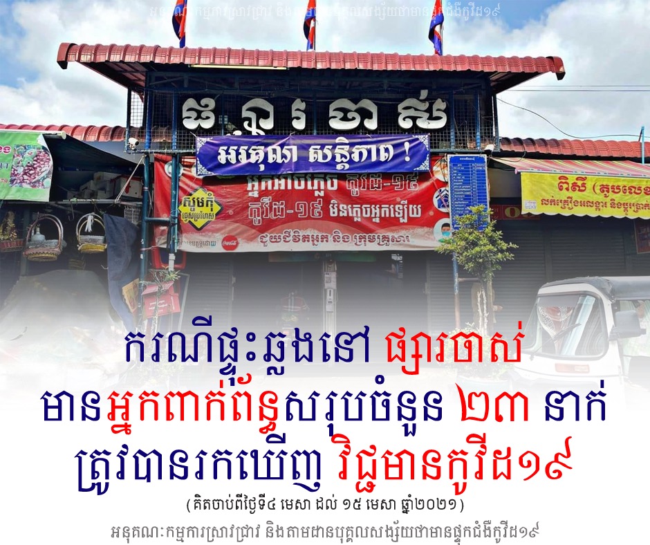 យោងតាមការបញ្ជាក់ពី អនុគណៈកម្មការស្រាវជ្រាវជំងឺកូវីដ១៩ បានឲ្យដឹងថា ករណីផ្ទុះការឆ្លងជំងឺកូវីដ១៩ នៅផ្សារចាស់អ្នកពាក់ព័ន្ធ សរុបចំនួន ២៣ នាក់ ត្រូវបានរកឃើញ វិជ្ជមានមេរោគកូវីដ-១៩ (COVID-19) គិតចាប់ពីថ្ងៃទី៤ ខែមេសា ដល់ ១៥ ខែមេសា ឆ្នាំ២០២១ ។