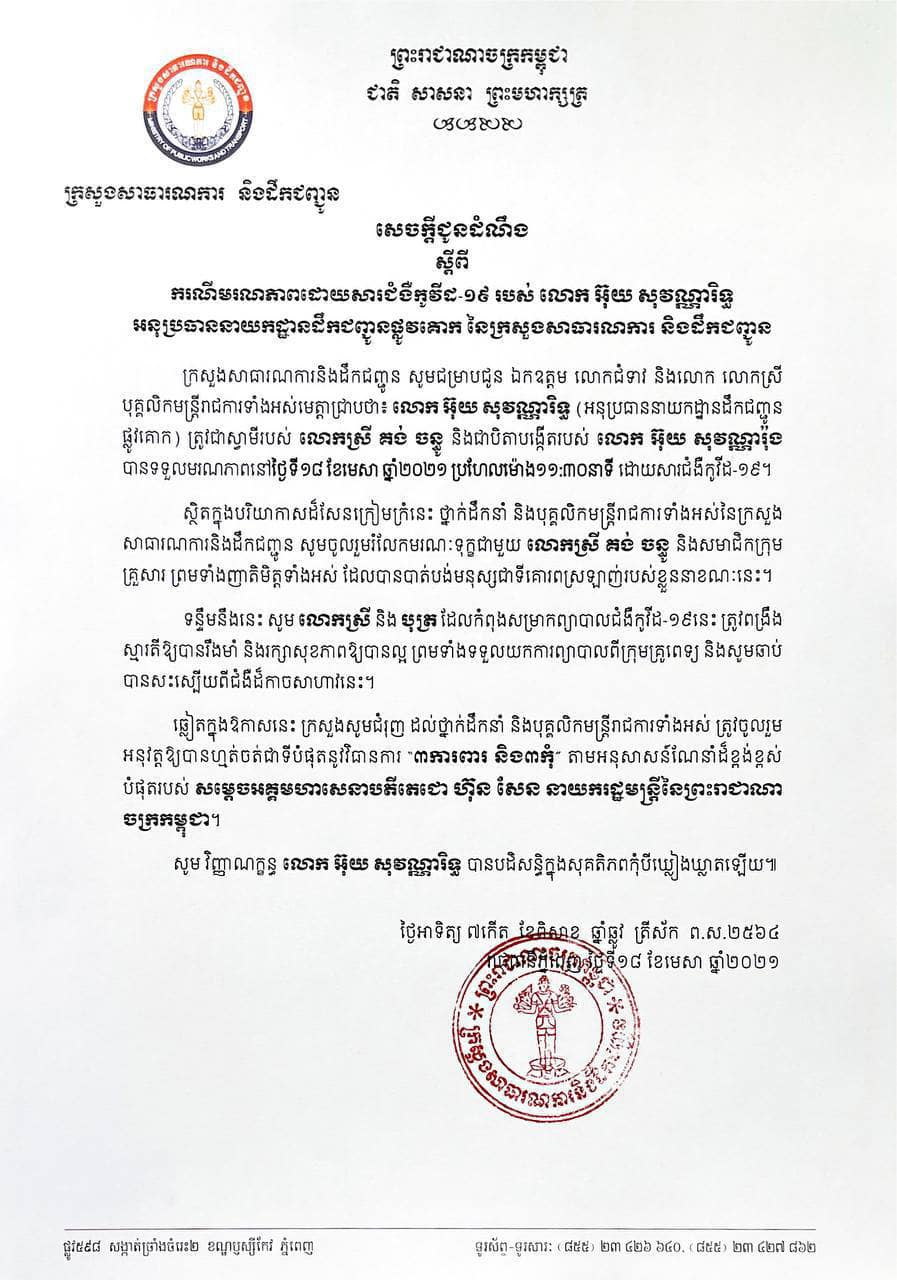 ក្រសួងសាធារណការ ចេញសេចក្តីជូនដំណឹង ស្តីពីមរណភាព លោកអនុប្រធាននាយកដ្ឋានដឹកជញ្ជូនផ្លូវគោក ដោយសារជំងឺកូវីដ-១៩