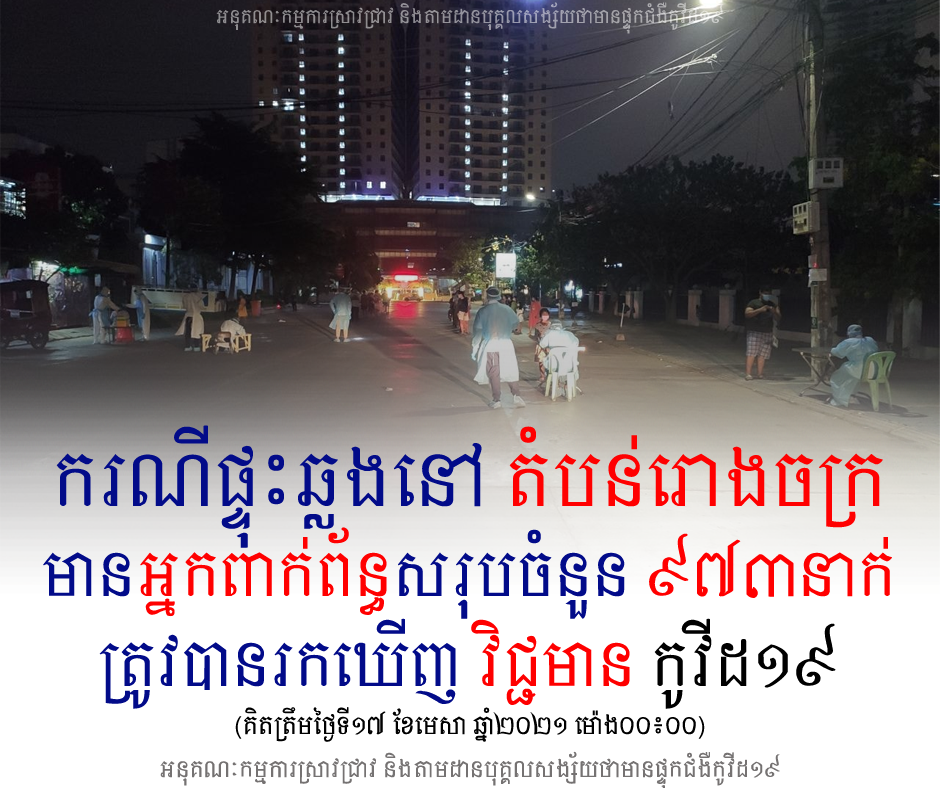 យោងតាមការបញ្ជាក់ពី អនុគណៈកម្មការស្រាវជ្រាវជំងឺកូវីដ១៩ បានឲ្យដឹងថា ករណីផ្ទុះការឆ្លងជំងឺ​ កូវីដ១៩ នៅតាមរោងចក្រ មានកម្មករ-កម្មការិនី និងអ្នកពាក់ព័ន្ធ សរុបចំនួន​ ៩៧៣នាក់​ ត្រូវបានរកឃើញ ​វិជ្ជមាន​កូវីដ១៩ គិតចាប់ពីថ្ងៃទី ២១ ខែមីនា ដល់ថ្ងៃទី១៧ ខែមេសា ឆ្នាំ២០២១។
