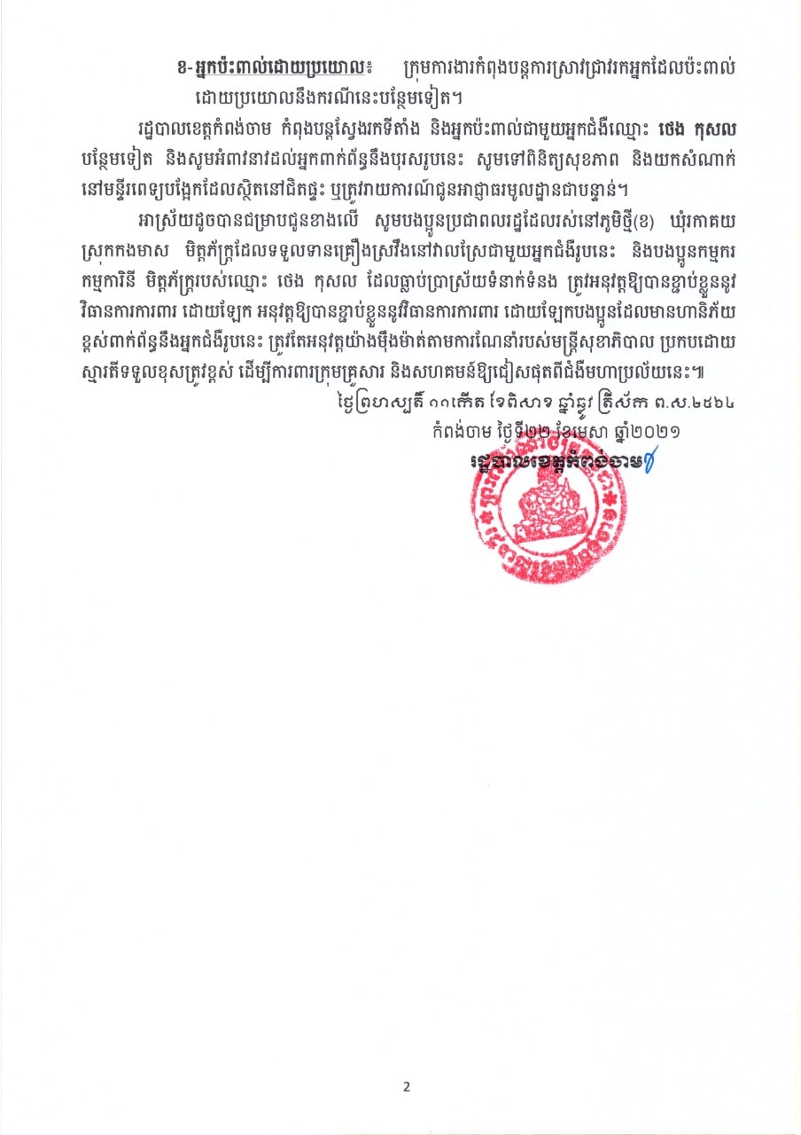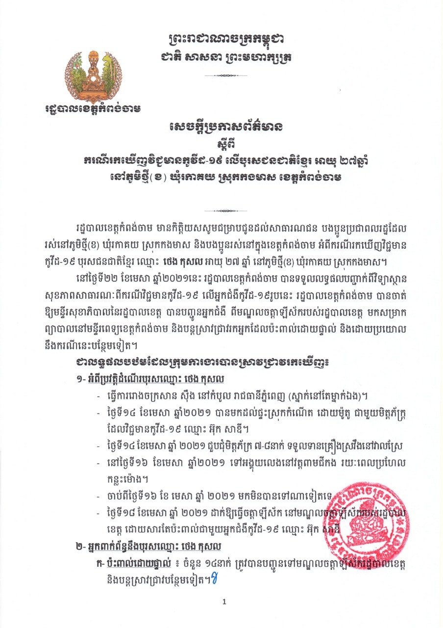 ខេត្តកំពង់ចាម៖ យោងតាមការចុះផ្សាយរបស់ រដ្ឋបាលខេត្តកំពង់ចាម បានចេញសេចក្តីប្រកាសព័ត៌មាន ស្តីពីករណីរកឃើញវិជ្ជមានកូវីដ-១៩ លើបុរសជនជាតិខ្មែរ អាយុ ២៧ឆ្នាំ នៅភូមិថ្មី(ខ) ឃុំរកាគយ ស្រុកកងមាស ខេត្កកំពង់ចាម។ រដ្ឋបាលខេត្តកំពង់ចាម សូមជម្រាបជូនសាធារណជន បងប្អូនប្រជាពលរដ្ឋដែលទាំងអស់ឲ្យបានជ្រាបថា៖ អំពីករណីរកឃើញវិជ្ជមានកូវីដ-១៩ បុរសជនជាតិខ្មែរ ឈ្មោះ ថេង កុសល អាយុ ២៧ឆ្នាំ នៅភូមិថ្មី(ខ) ឃុំរកាគយ ស្រុកកងមាស។