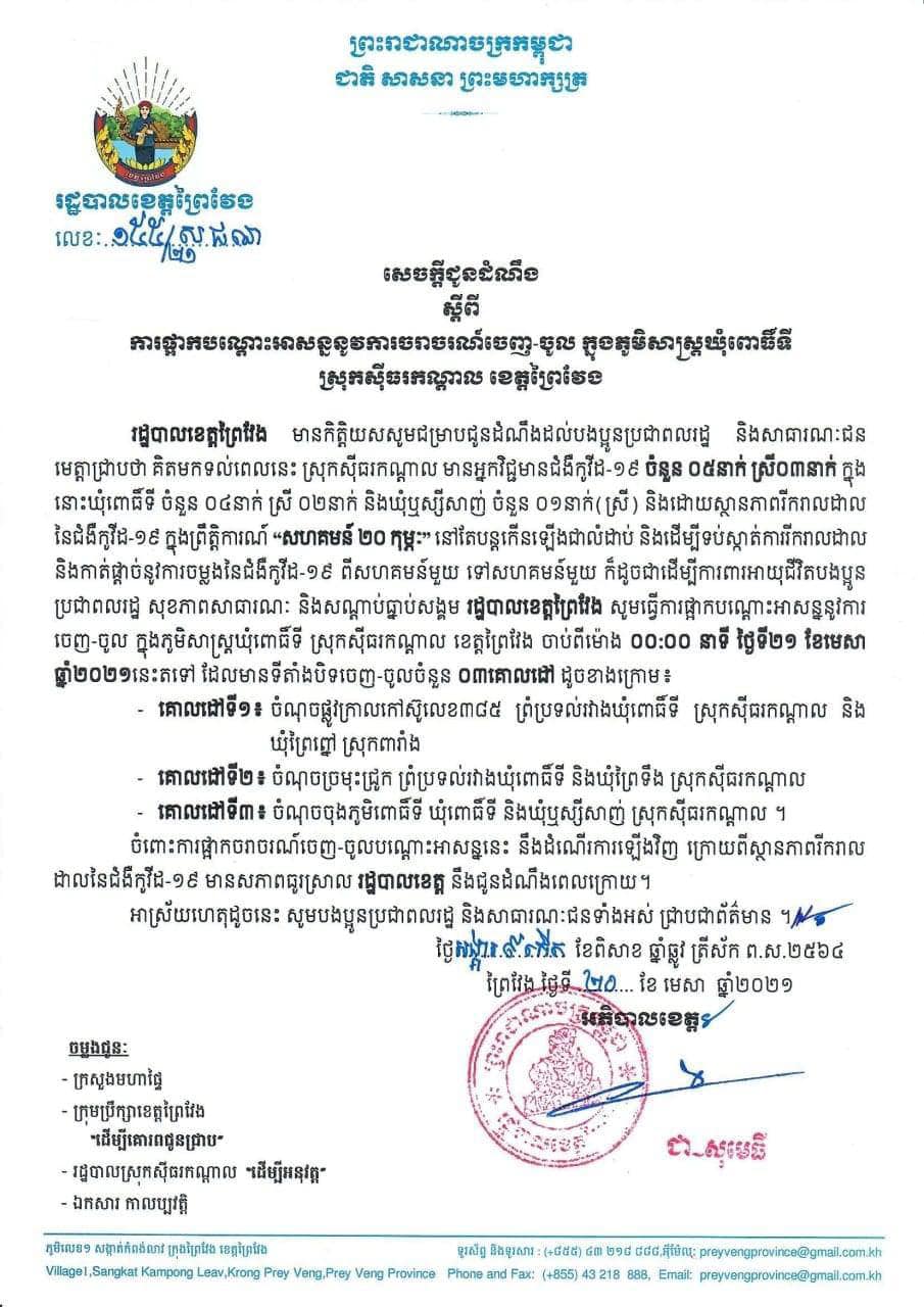 រដ្ឋបាលខេត្តព្រៃវែង ផ្អាកបណ្តោះអាសន្នការចេញ-ចូល ក្នុងភូមិសាស្ត្រ ឃុំពោធិ៍ទី ស្រុកស៊ីធរកណ្តាល