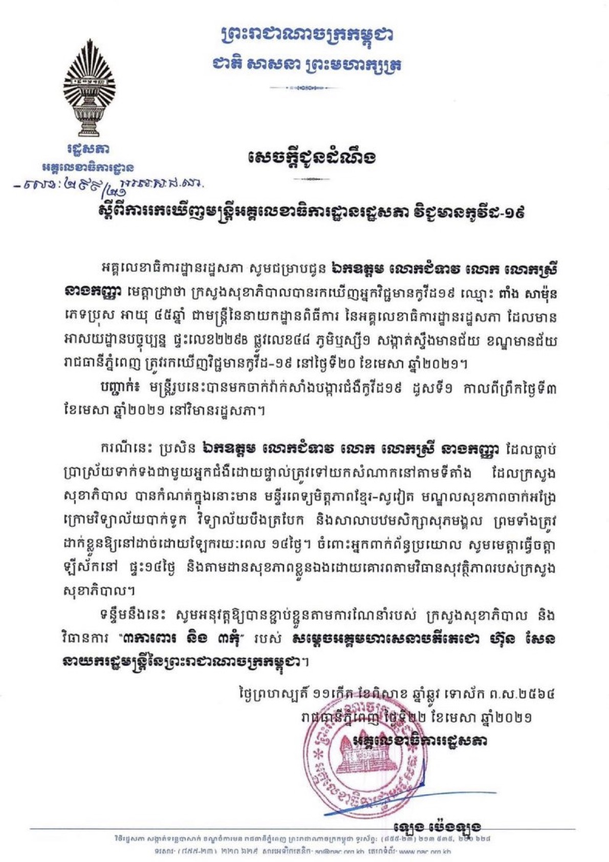 យោងតាមការបញ្ជាក់ពីរដ្ឋសភា បានឲ្យដឹងថា ក្រសួងសុខាភិបាលបានរកឃើញអ្នកវិជ្ជមានកូវីដ១៩ ឈ្មោហ ពាំង សាម៉ុន ភេទប្រុស អាយុ៤៥ឆ្នាំ ជាមន្ត្រីនៃនាយកដ្ឋានពិធីការ នៃអគ្គលេខធិការដ្ឋានរដ្ឋសភា ដែលមានអាសយដ្ឋានបច្ចុប្បន្ន ផ្ទះលេខ ២២៩B ផ្លូវលេខ៤៨ ភូមិឬស្សីឆ សង្កាត់ស្ទឹងមានជ័យ ខណ្ឌមានជ័យ រាជធានីភ្នំពេញ ត្រូវបានរកឃើញវិជ្ជមានកូវីដ១៩ នៅថ្ងៃទី២០ ខែមេសា ឆ្នាំ២០២១។