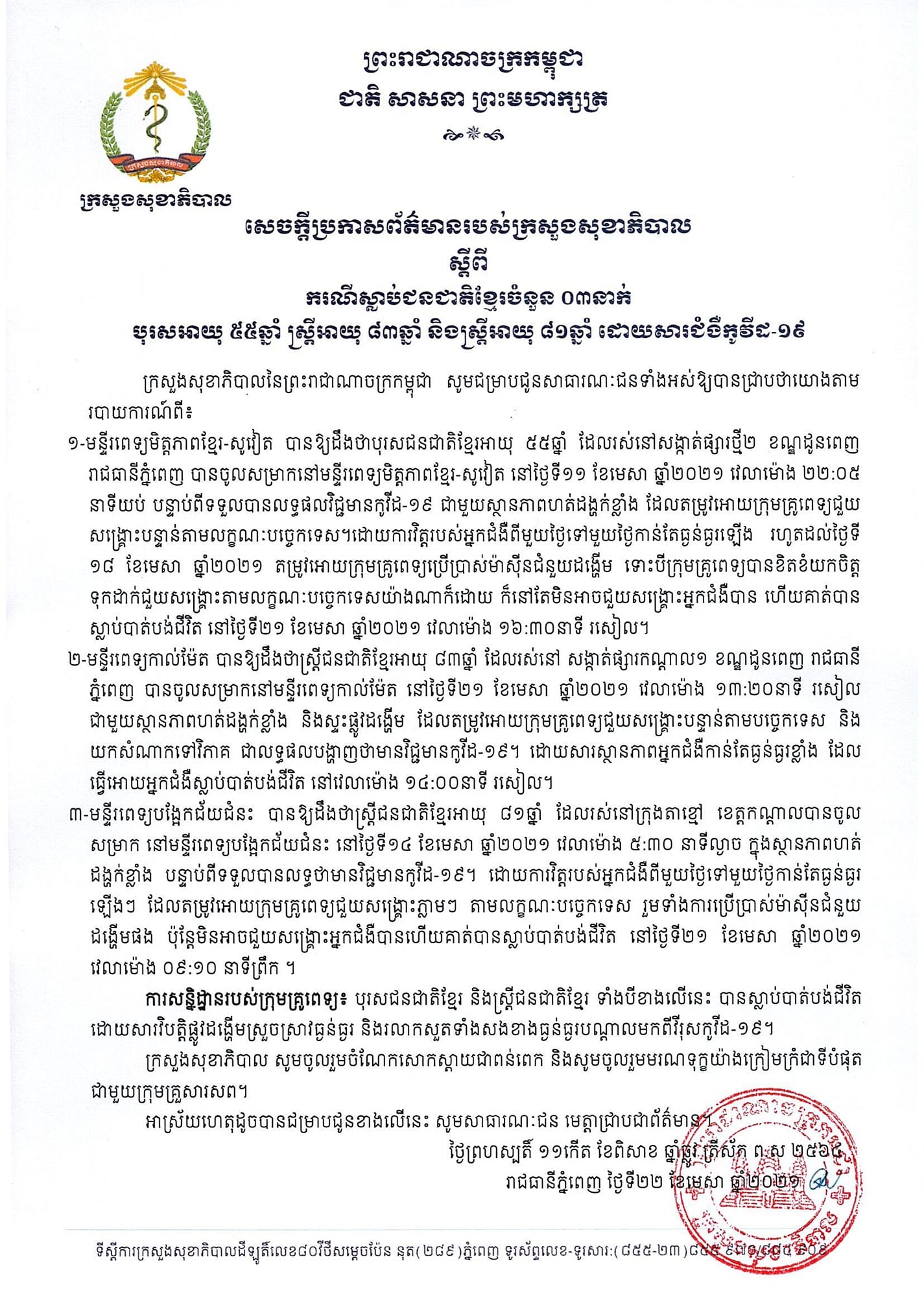 មុននេះបន្តិចក្រសួងសុខាភិបាលកម្ពុជា បានចេញសេចក្តីប្រកាសព័ត៌មានមួយពីករណីជនជាតិខ្មែរចំនួន ៣ នាក់បានស្លាប់បាត់បង់ជីវិតដោយសារតែជំងឺកូវីដ១៩។ ក្រសួងសុខាភិបាលបានប្រកាសថា ថ្ងៃទី២១ ខែមេសា ឆ្នាំ២០២១ មានករណីស្លាប់ជនជាតិខ្មែរចំនួន ០៣នាក់៖ បុរសឣាយុ ៥៥ឆ្នាំ ស្រ្តីឣាយុ ៨៣ឆ្នាំនិងស្រ្តីឣាយុ ៨១ឆ្នាំ ដោយសារជំងឺកូវីដ-១៩។ សូមប្រិយមិត្តអានសេចក្តីប្រកាសព័ត៌មានខាងក្រោមនេះ៖