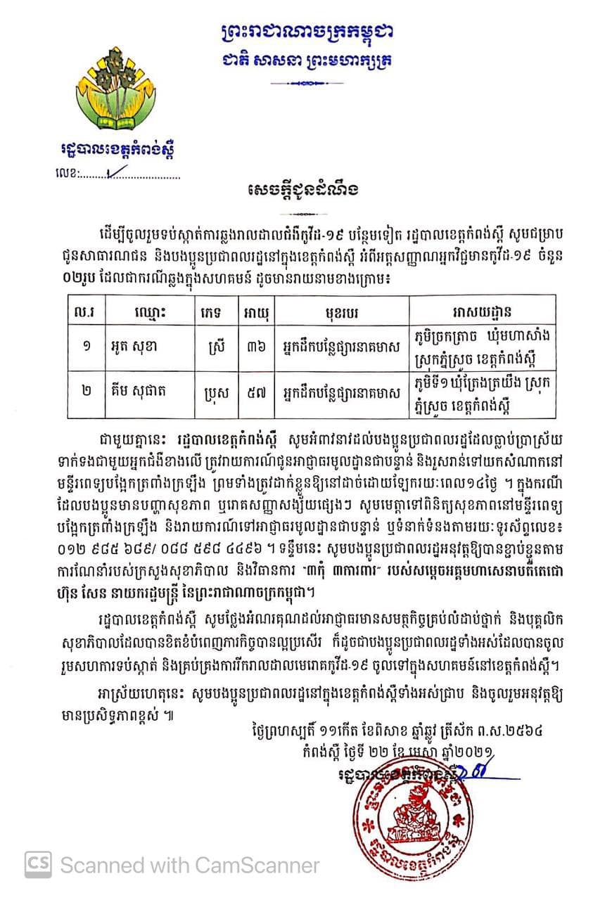 ខេត្តកំពង់ស្ពឺ៖ យោងតាមសារលិខិតរបស់ រដ្ឋបាលខេត្តកំពង់ស្ពឺ បានចេញសេចក្ដីជូនដំណឹង ស្ដីពីករណីរកឃើញវិជ្ជមានកូវីដ-១៩ ចំនួន ០២នាក់ ដែលជាករណីឆ្លងក្នុងសហគមន៍ ដោយរដ្ឋបាលខេត្តកំពង់ស្ពឺ សូមជម្រាបជូនសាធារណជន និងបងប្អូនប្រជាពលរដ្ឋនៅក្នុងខេត្តកំពង់ស្ពឺ អំពីអត្តសញ្ញាណអ្នកវិជ្ជមានកូវីដ-១៩ ចំនួន ០២នាក់ ដូចមានឈ្មោះខាងក្រោម៖
