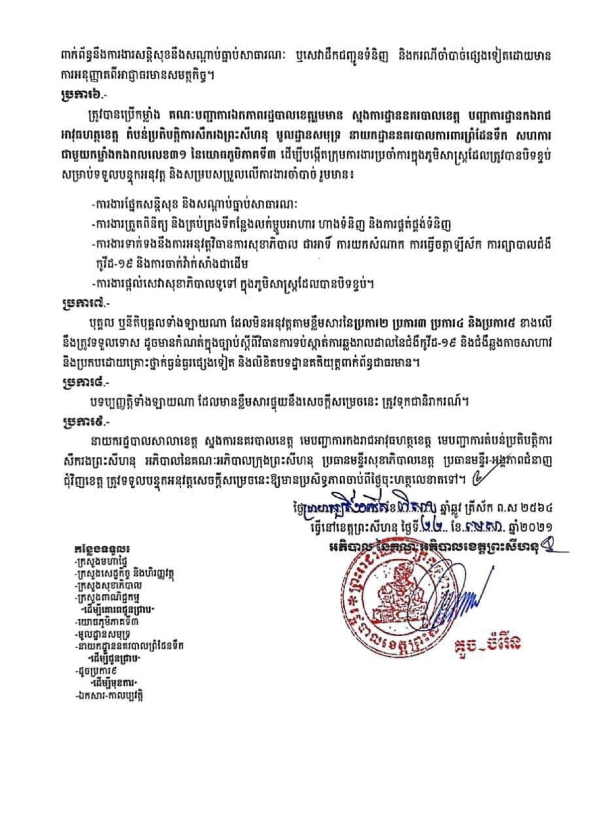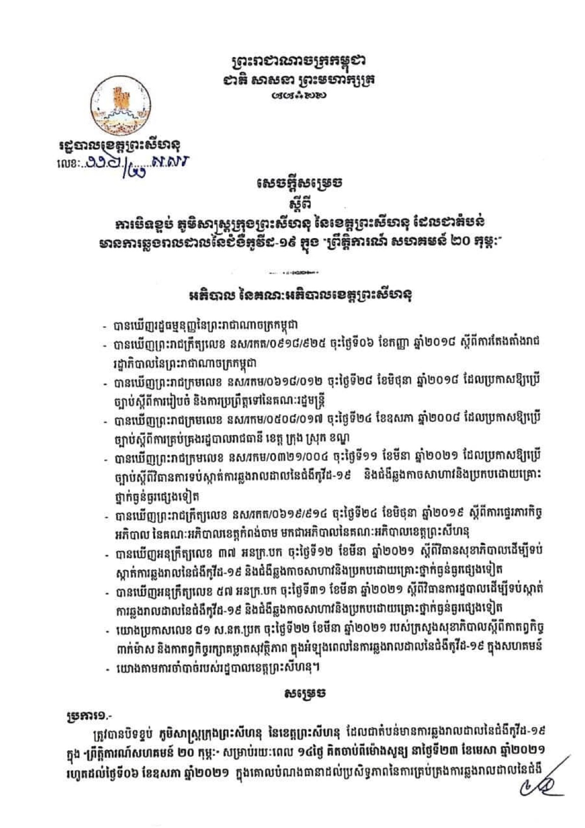 យោងតាមការបញ្ជាក់ពី រដ្ឋបាលខេត្តព្រះសីហនុ បានសម្រេចធ្វើការបិទខ្ទប់ ភូមិសាស្ត្រក្រុងព្រះសីហនុ នៃខេត្តព្រះសីហនុ ដែលជាតំបន់មានការឆ្លងរាលដាលនៃជំងឺកូវីដ១៩ក្នុង ព្រឹត្តិការណ៍សហគមន៍ ២០កុម្ភៈ សម្រាប់រយៈពេល១៤ថ្ងៃ គិតចាប់ពីម៉ោងសូន្យ នាថ្ងៃទី២៣ ខែមេសា រហូតដល់ថ្ងៃទី០៦ ខែឧសភា ឆ្នាំ២០២១ ក្នុងគោលបំណងធានាដល់ប្រសិទ្ធភាពនៃការគ្រប់គ្រងការឆ្លងរាលដាលនៃជំងឺកូវីដ១៩ នៅក្នុងភូមិសាស្ត្រដែលត្រូវបានបិទខ្ទប់ និងទប់ស្កាត់ជំងឺនេះមិនឲ្យរាលដាលទៅតំបន់ផ្សេងទៀត៕