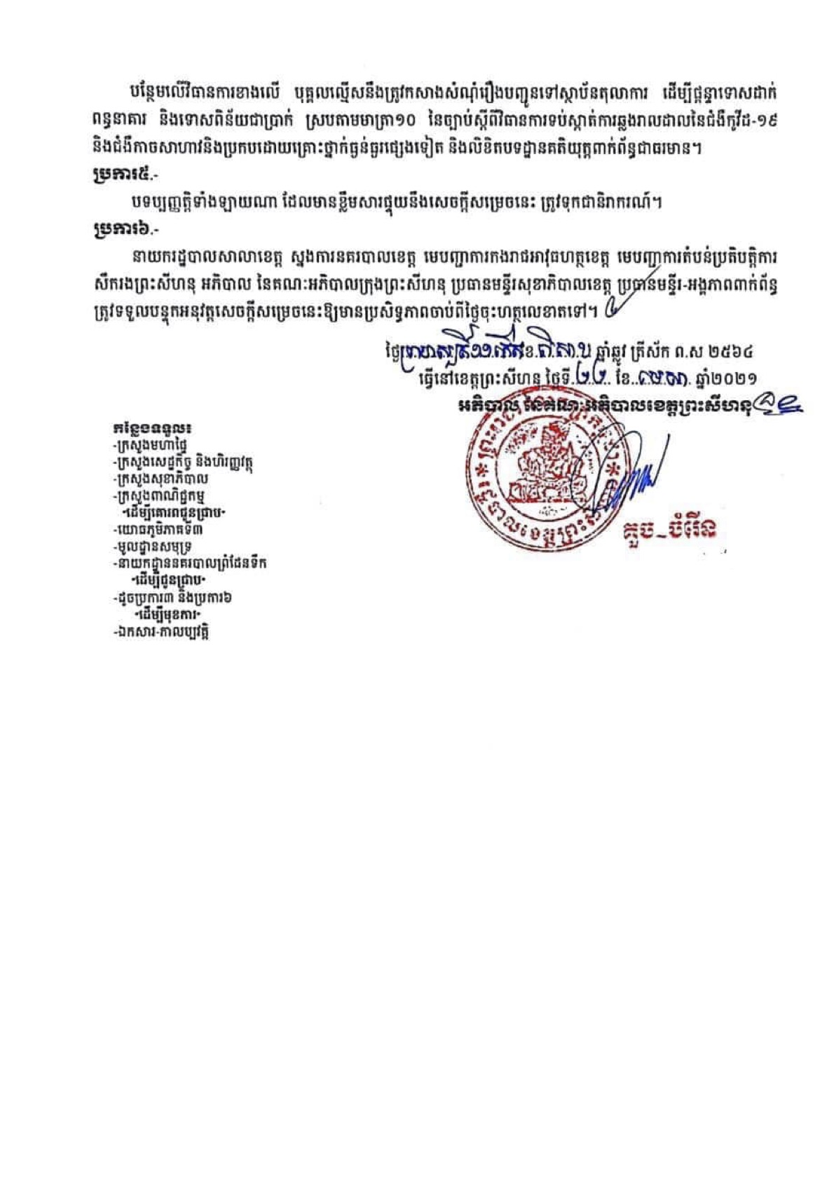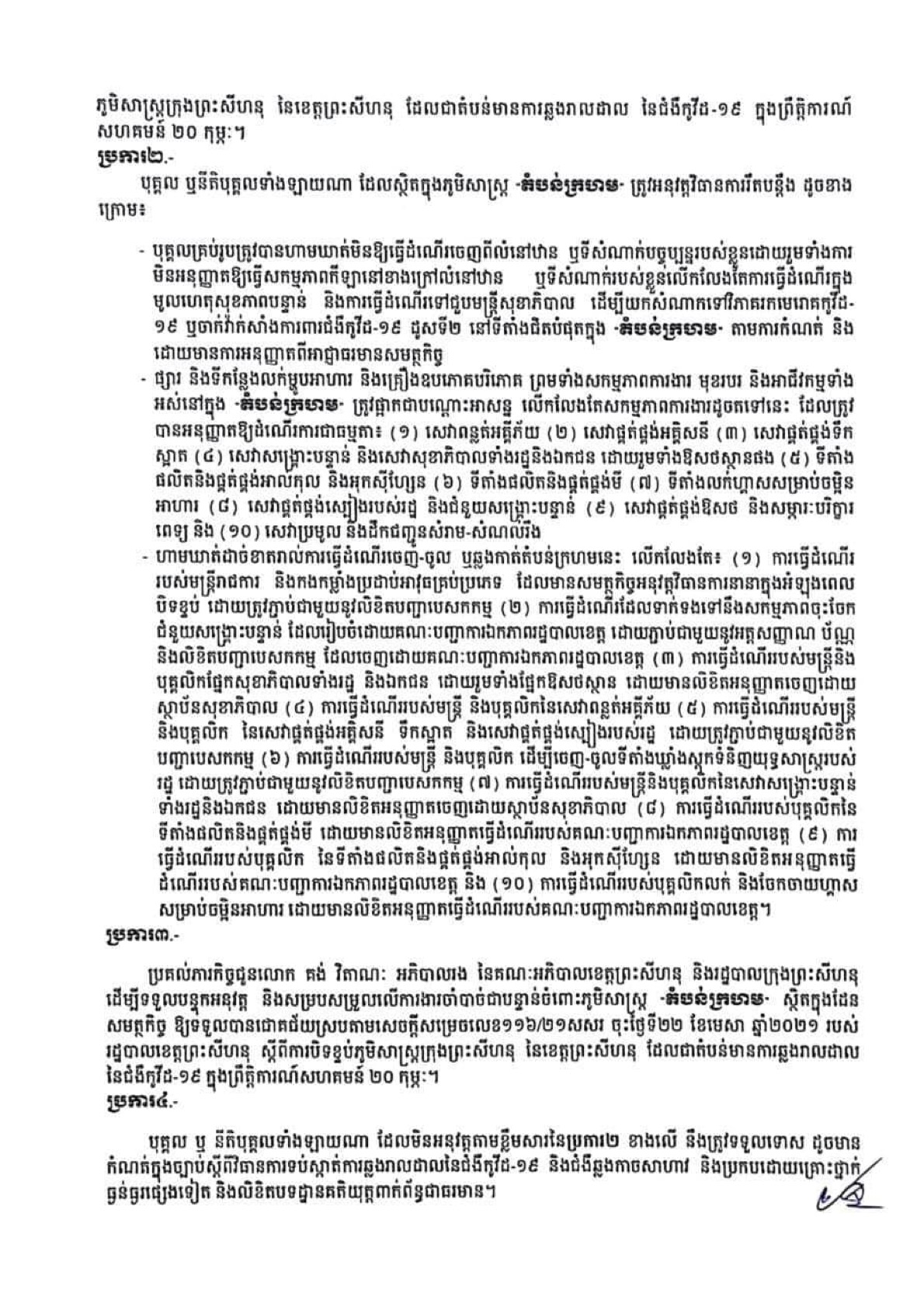 ទន្ទឹមនឹងនោះផងដែរ រដ្ឋបាលខេត្តព្រះសីហនុ បានកំណត់ភូមិសាស្ត្រ ភូមិ១ ភូមិ២ ភូមិ៣ ភូមិ៤ ភូមិ៥ នៃសង្កាត់លេខ៤ ក្រុងព្រះសីហនុ ខេត្តព្រះសីហនុ ដែលមានការឆ្លងរាលដាលធ្ងន់ធ្ងរនៃជំងឺកូវីដ១៩ ជា តំបន់ក្រោម ក្នុងគោលបំណងធានាដល់ប្រសិទ្ធភាពនៃសេចក្តីសម្រេចលេខ ១១៦/២១សសរ ចុះថ្ងៃទី២២ ខែមេសា ឆ្នាំ២០២១ របស់រដ្ឋបាលខេត្តព្រះសីហនុ ស្តីពីការបិទខ្ទប់ភូមិសាស្ត្រក្រុងព្រះសីហនុ នៃខេត្តព្រះសីហនុ ដែលជាតំបន់មានការឆ្លងរាលដាលនៃជំងឺកូវីដ១៩ក្នុង ព្រឹត្តិការណ៍សហគមន៍ ២០កុម្ភៈ ៕