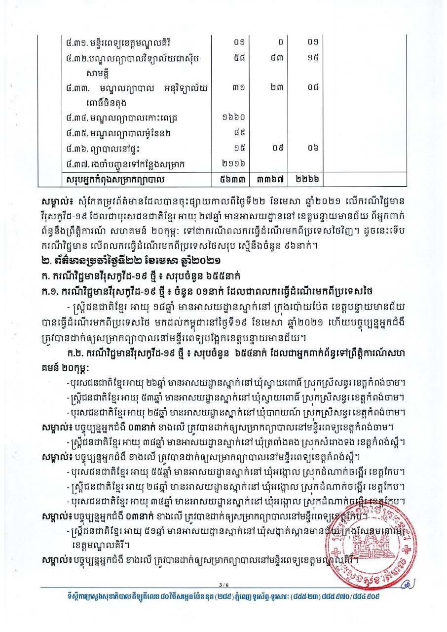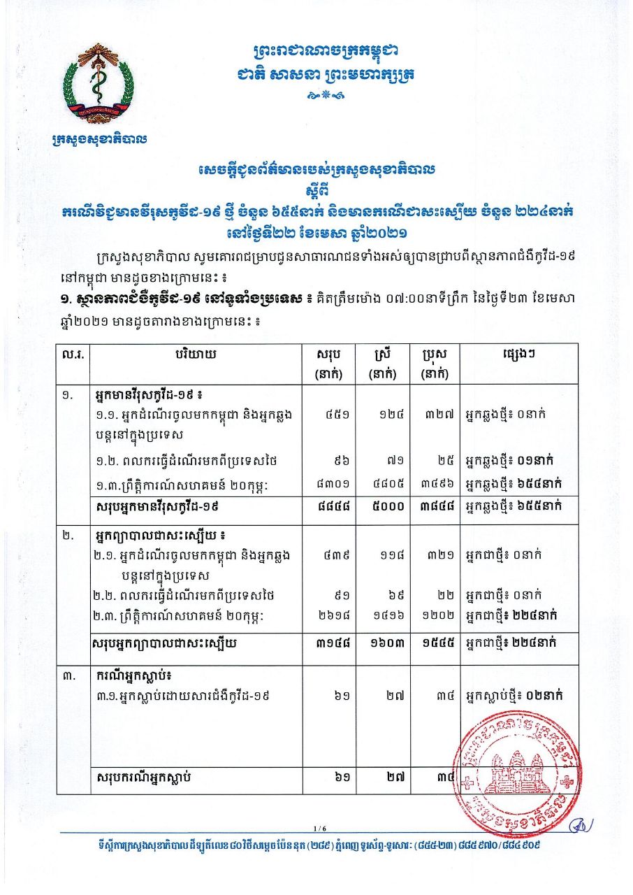នៅថ្ងៃទី២៣ ខែមេសា ឆ្នាំ២០២១នេះ ក្រសួងសុខាភិបាលកម្ពុជា បានចេញសេចក្តីជូនដំណឹងពី ការរកឃើញករណីវិជ្ជមានវីរុសកូវីដ១៩ថ្មី ចំនួន ៦៥៥នាក់ និងមានករណីជាសះស្បើយថ្មីចំនួន ២២៤នាក់ផងដែរ។