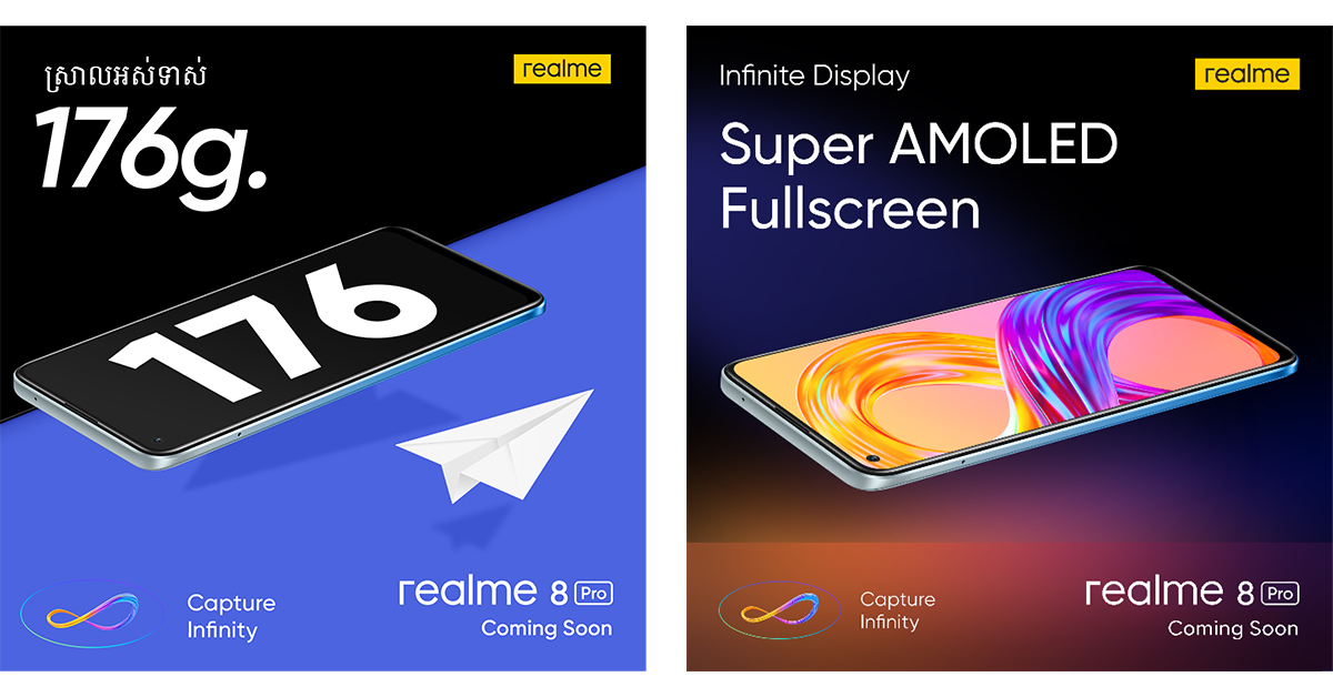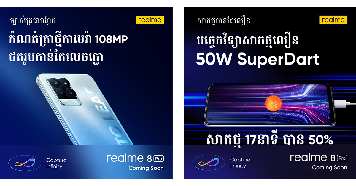 កាលពីថ្មីៗនេះ realme បានប្រកាសថា realme 8 Pro ដែលមានបំពាក់បច្ចេកវិទ្យាសាកថ្មលឿន 50W SuperDart Charge ដែលជិតនឹងដាក់ប្រកាសឆាប់ៗនេះ អាចសាកបានដល់ 50% ក្នុងរយៈពេលត្រឹម 17នាទី។ ក្រុមហ៊ុនស្មាតហ្វូន realme ដែលជាប្រេនស្មាតហ្វូនលូតលាស់លឿនបំផុតក្នុងពិភពលោក បានបង្ហាញនូវវត្តមានកាមេរ៉ាទំហំ 108MP ដំបូងបង្អស់របស់ខ្លួនដែលបានបំពាក់លើស្មាតហ្វូនស៊េរីថ្មី គឺ realme 8 Pro ហើយវាគឺជាបច្ចេកវិទ្យាកាមេរ៉ាទំនើបចុងក្រោយ។ នេះមានន័យថា realme នឹងក្លាយជាក្រុមហ៊ុនស្មាតហ្វូនដំបូងគេនៅក្នុងប្រទេសកម្ពុជាដែលបាននាំយកកាមេរ៉ាធំ 108MP និង បច្ចេកវិទ្យាសាកថ្មលឿនកម្រិត Flagship ដាក់នៅលើស្មាតហ្វូនជួរតម្លៃ $300-$400 អាចឲ្យយុវវ័យកាន់តែច្រើនបានប្រើប្រាស់បច្ចេកវិទ្យាពេញនិយមនិងឈានមុខគេ និងក្លាយជាអ្នកផ្សព្វផ្សាយបច្ចេកវិទ្យាពេញនិយមពិតប្រាកដ។ អ្នកអាចស្វែងយល់បន្ថែមដោយស្វែងរក realme ឬ reame 8 Pro នៅលើ www.google.com ។
